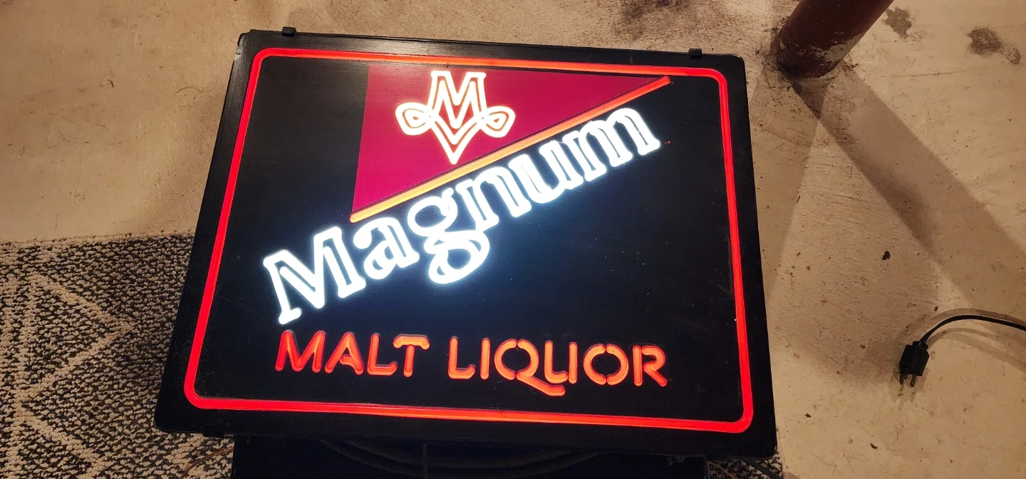 Light up your space with this "Magnum Malt Liquor" neon sign! It's got bright white and orange neon lights, perfect for a bar or man cave. A classic sign for any collector!