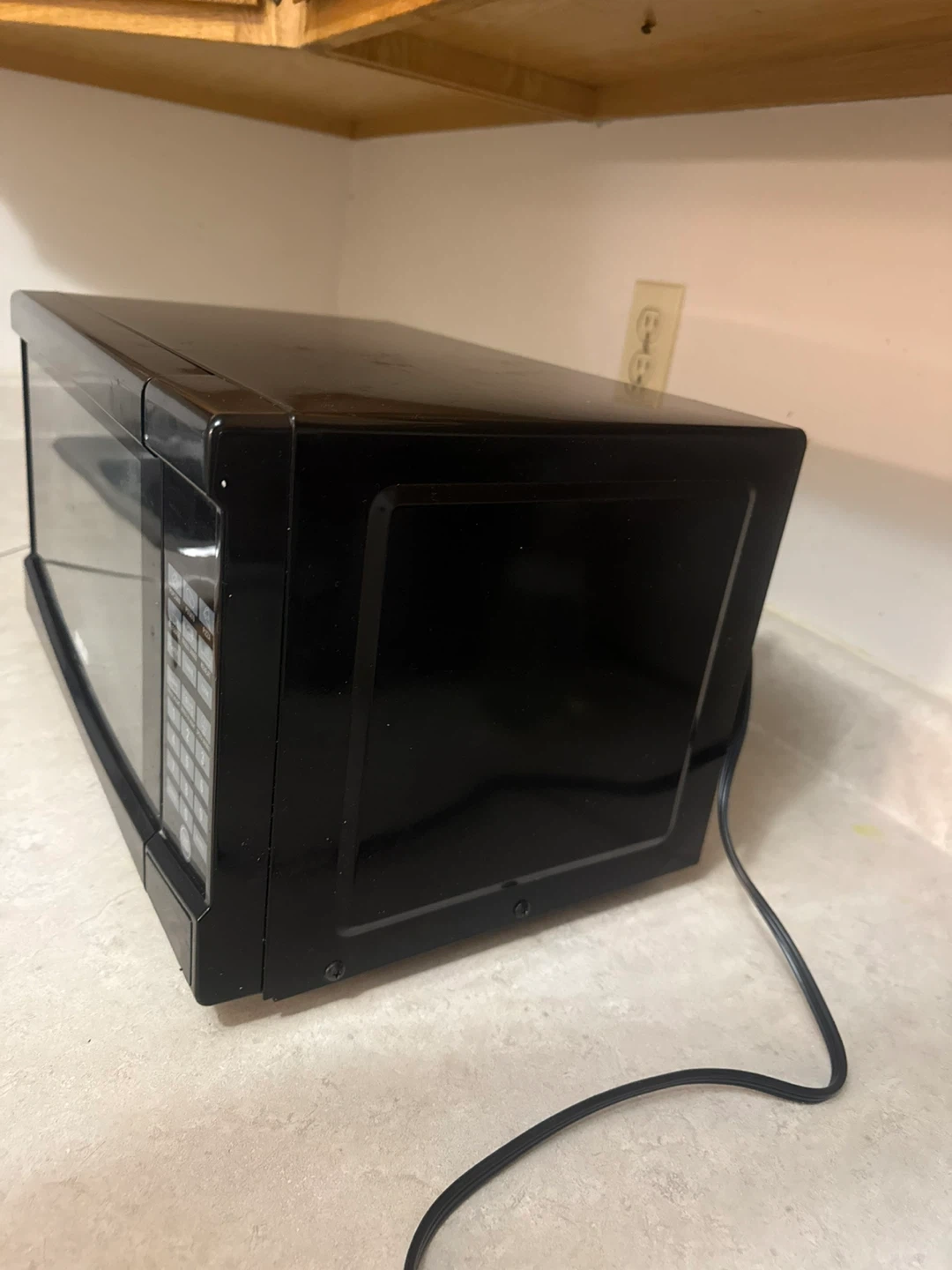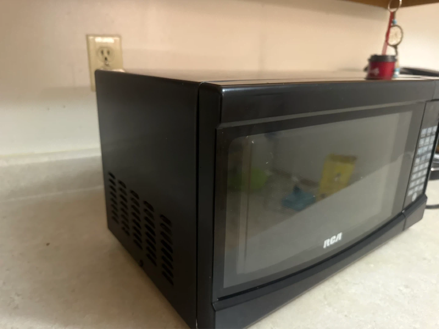 Black RCA countertop microwave. It has a glass turntable inside. Features pre-programmed buttons for popcorn, potato, and pizza.