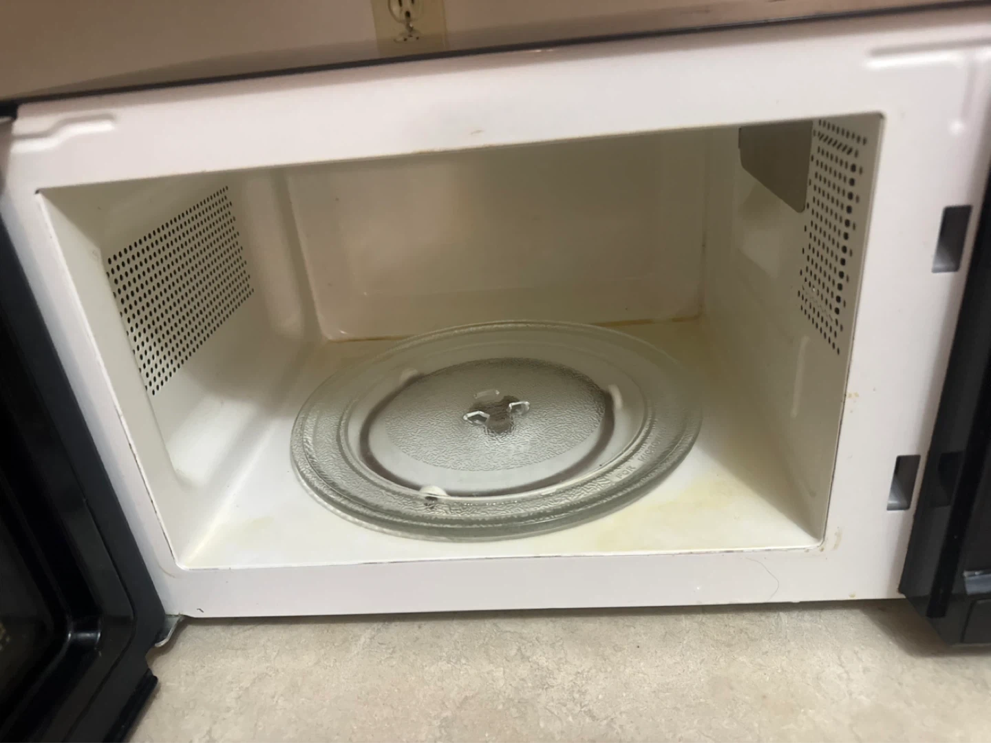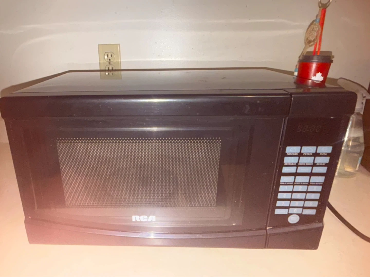 Black RCA countertop microwave. It has a glass turntable inside. Features pre-programmed buttons for popcorn, potato, and pizza.