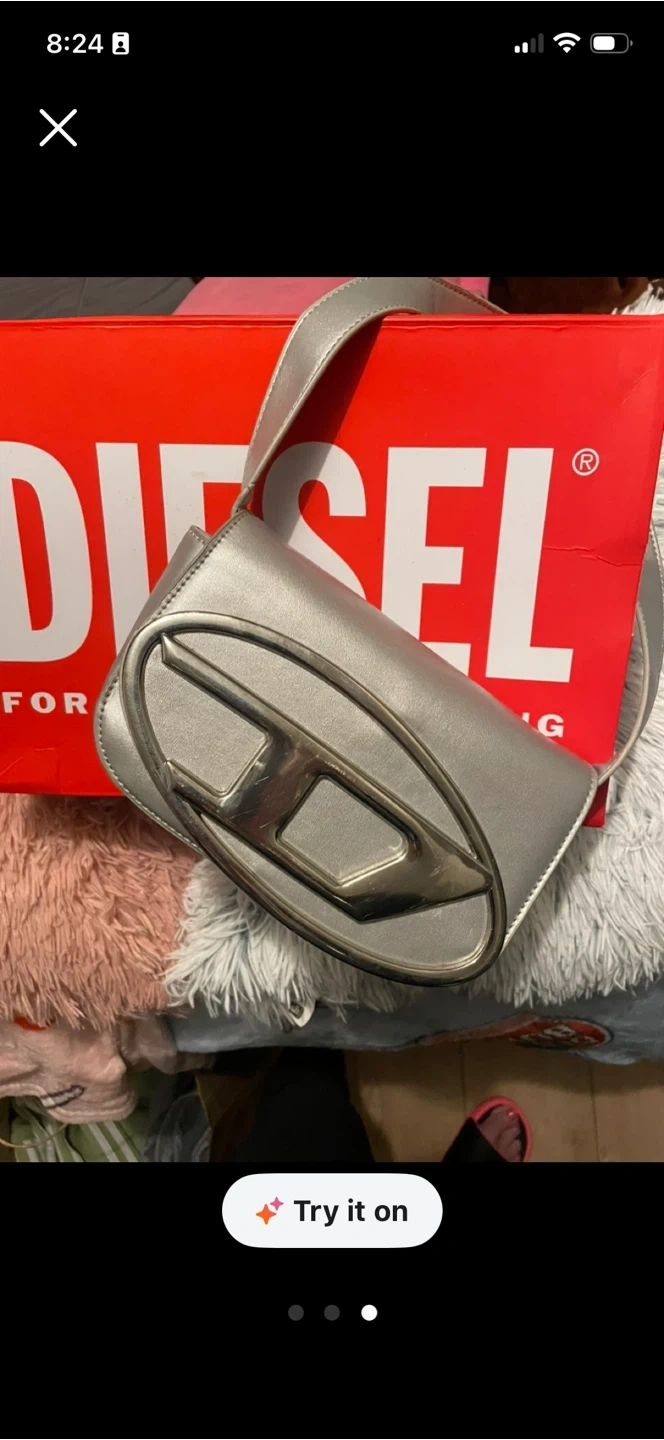 This is a silver shoulder bag from Diesel. It features the iconic large D logo on the front. Bag includes its original box.