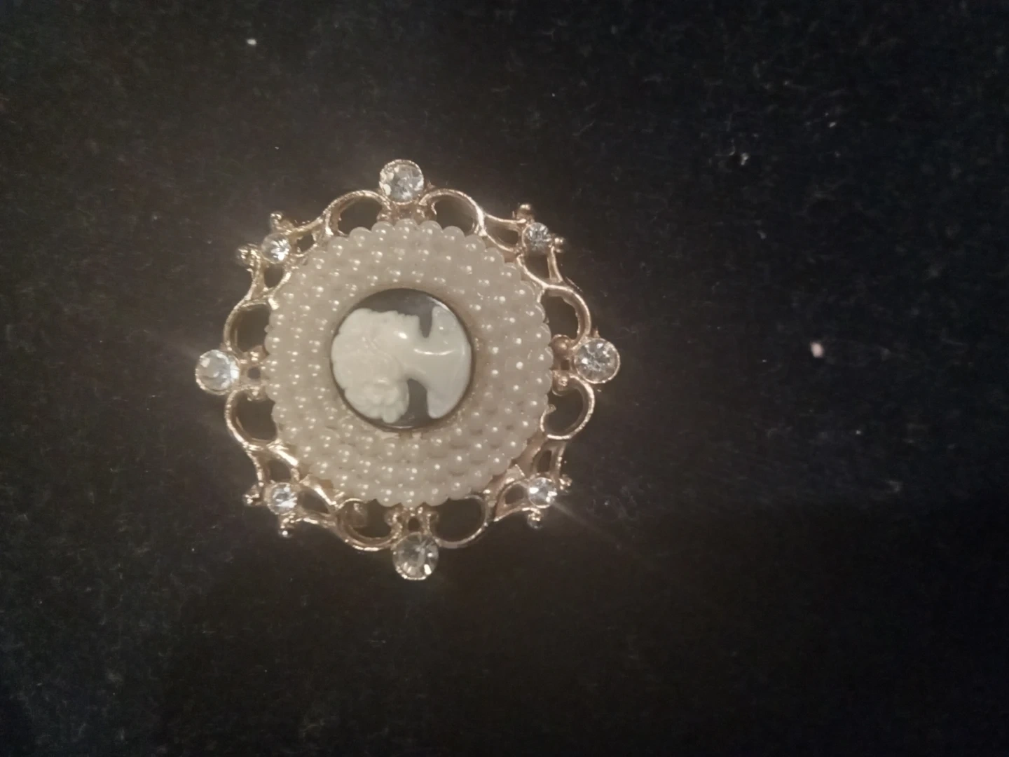 Beautiful Coro cameo brooch featuring a classic silhouette surrounded by faux pearls and sparkling rhinestones. This elegant piece would make a lovely addition to any outfit or collection