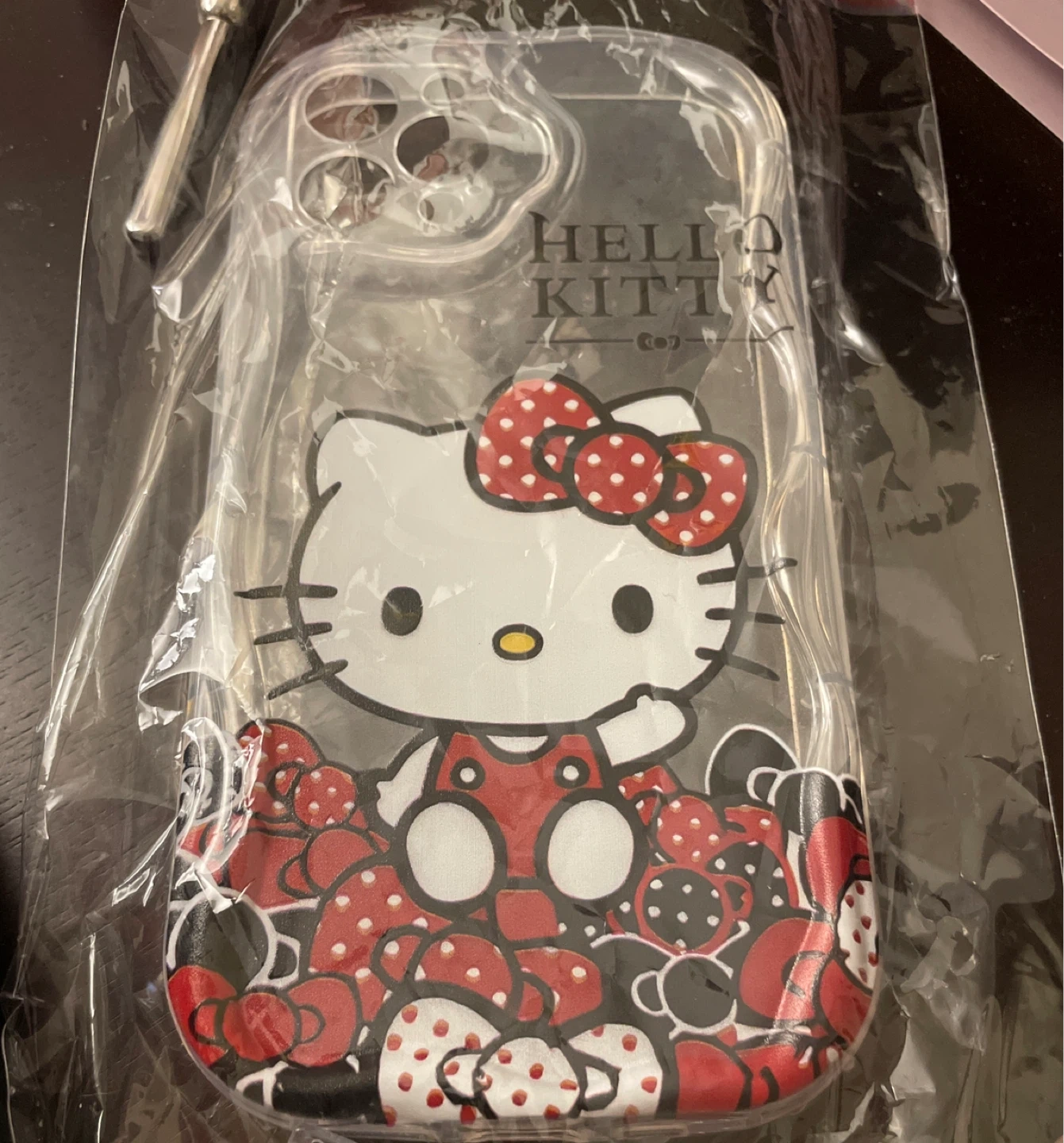 This is a Hello Kitty phone case with a clear design. It features Hello Kitty in a red and white polka dot dress, surrounded by bows. The case has cutouts for the camera and buttons.