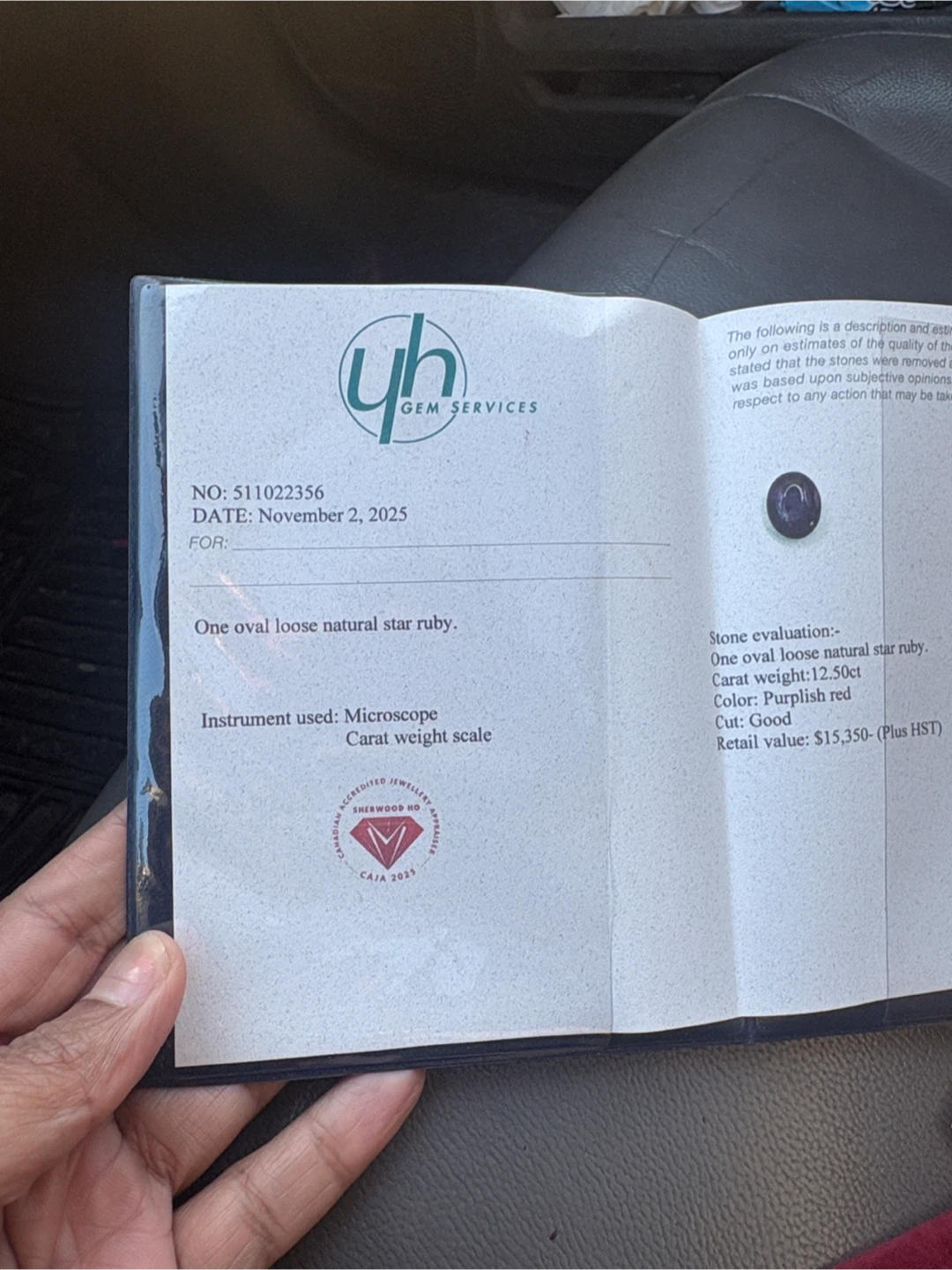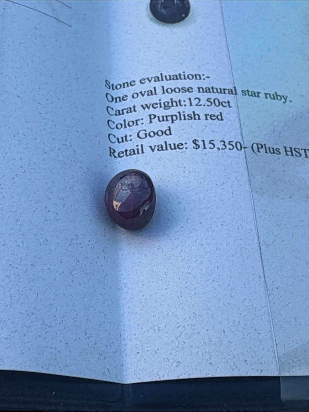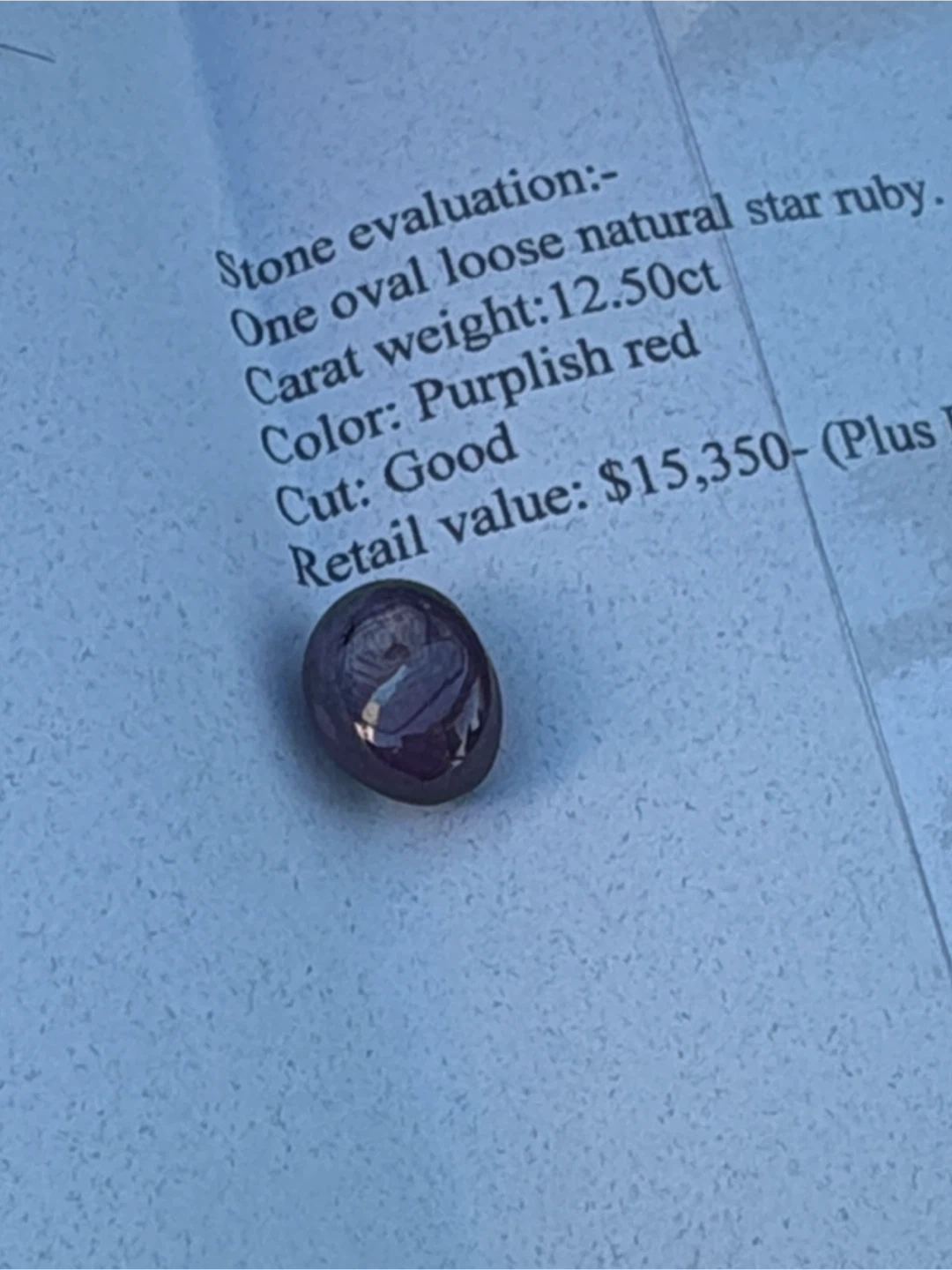 Selling a natural star ruby. It is an oval loose stone with a weight of 12.50ct. The colour is a purplish red and the cut is good. It comes with a certificate of appraisal from YH Gem Services.