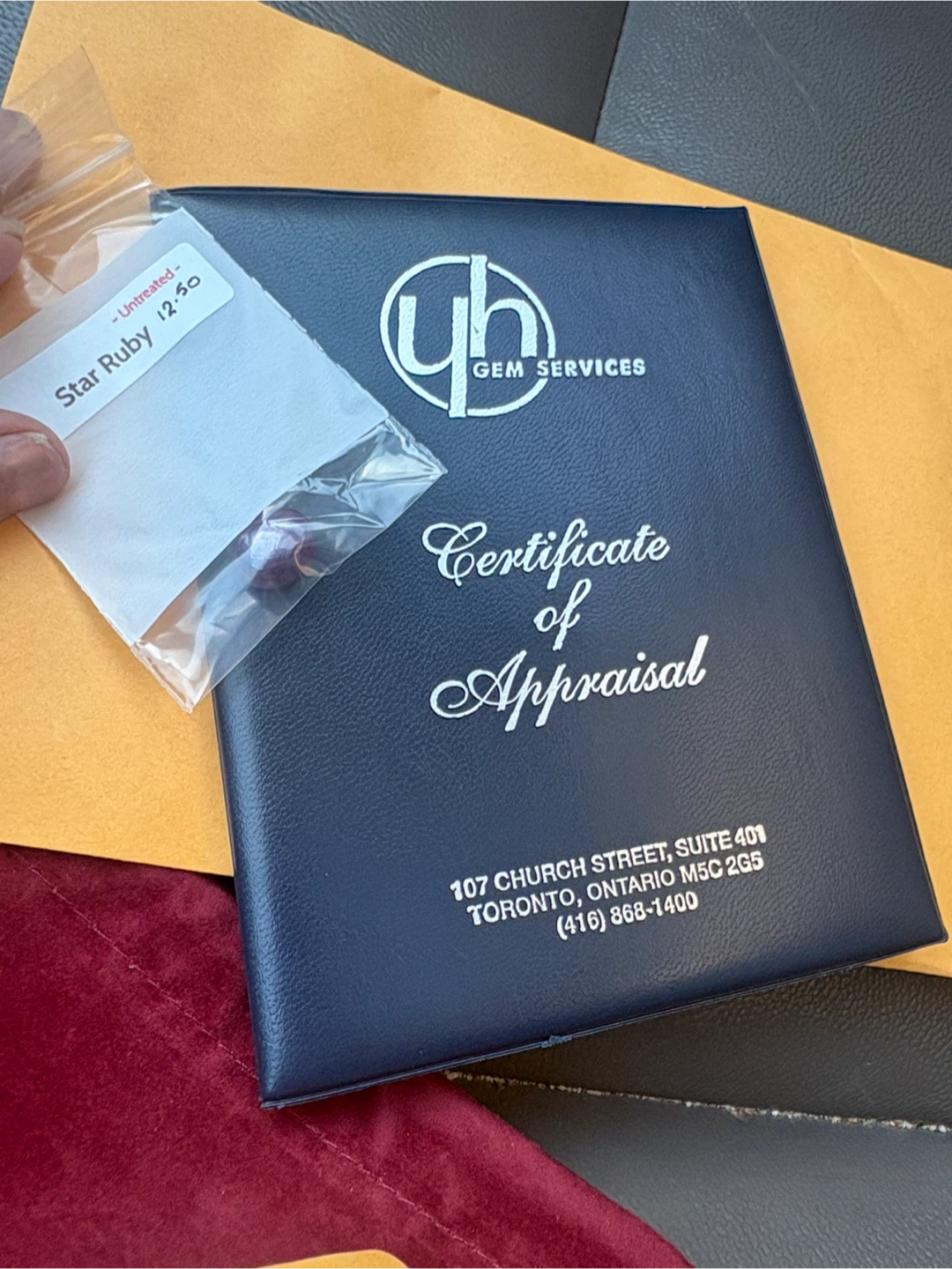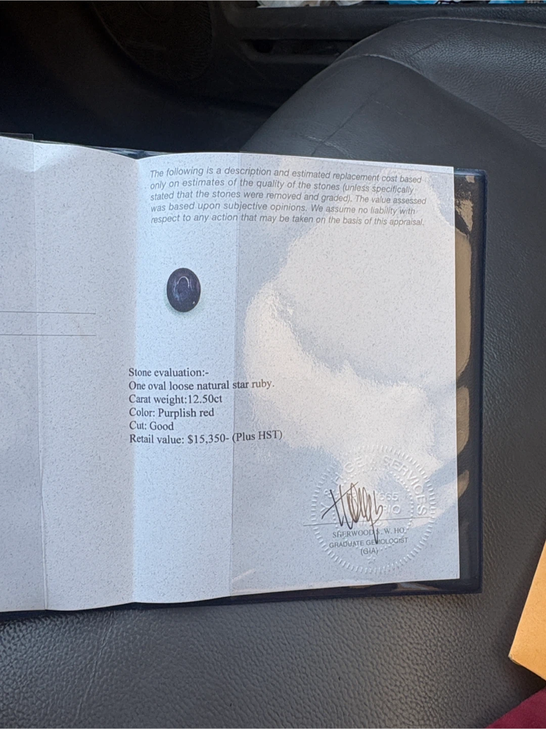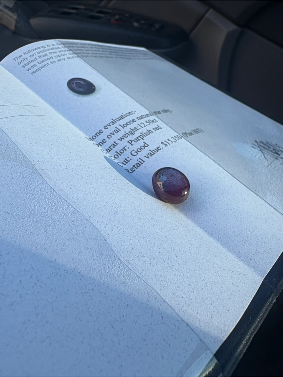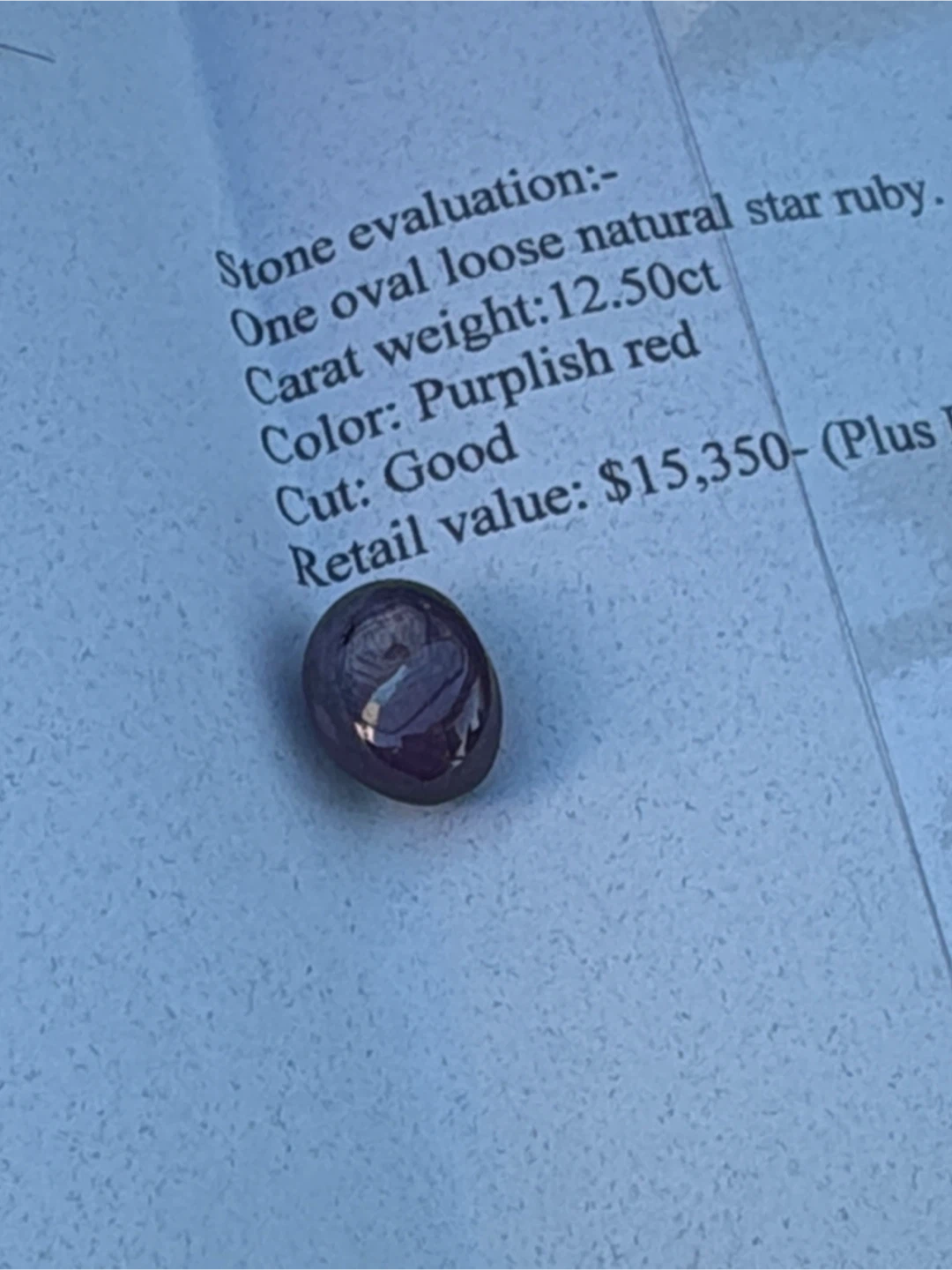 Selling a natural star ruby. It is an oval loose stone with a weight of 12.50ct. The colour is a purplish red and the cut is good. It comes with a certificate of appraisal from YH Gem Services.
