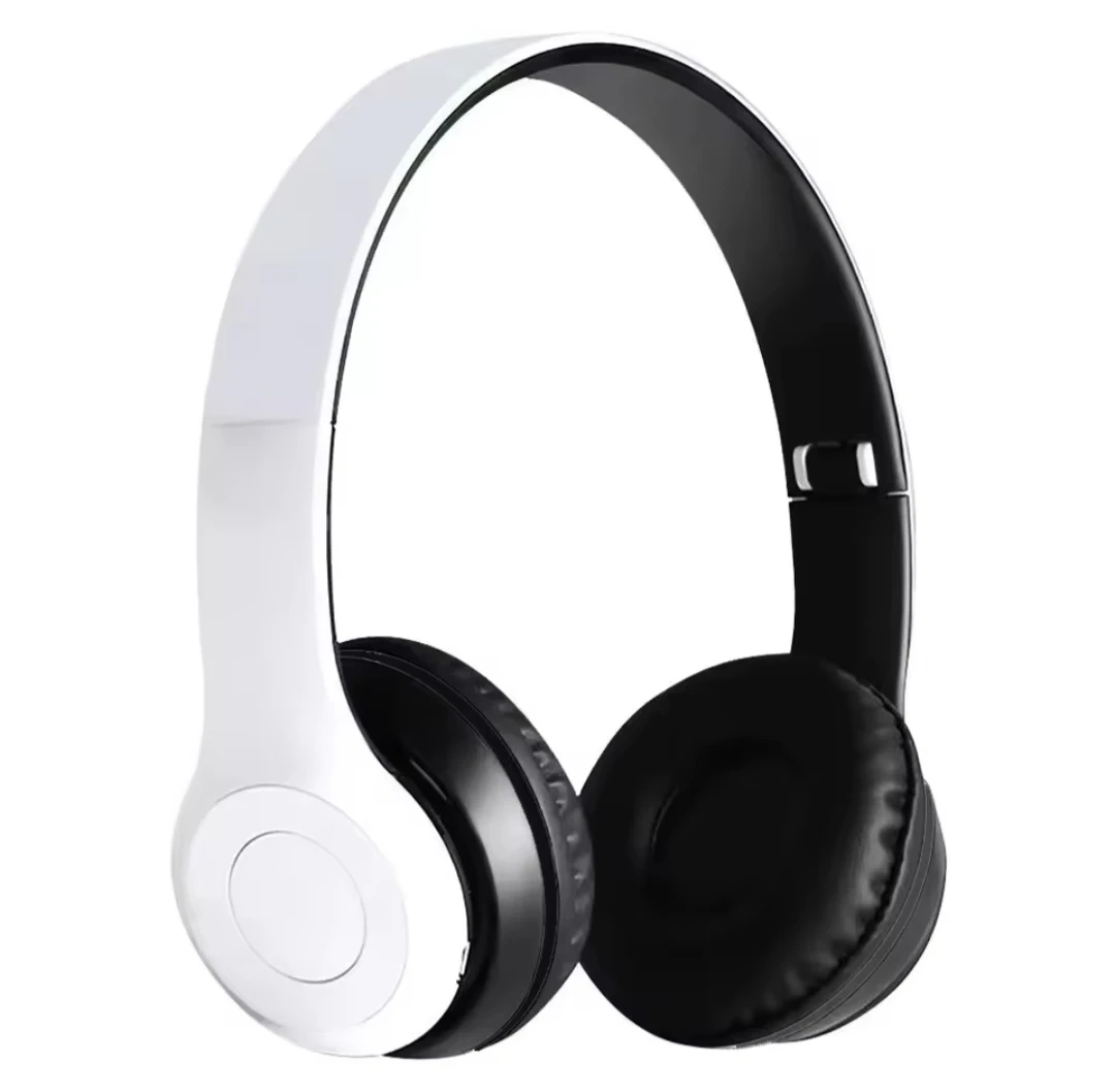 These are over-ear headphones with a white exterior and black earcups. They're designed for comfortable listening. They're adjustable to fit different head sizes.