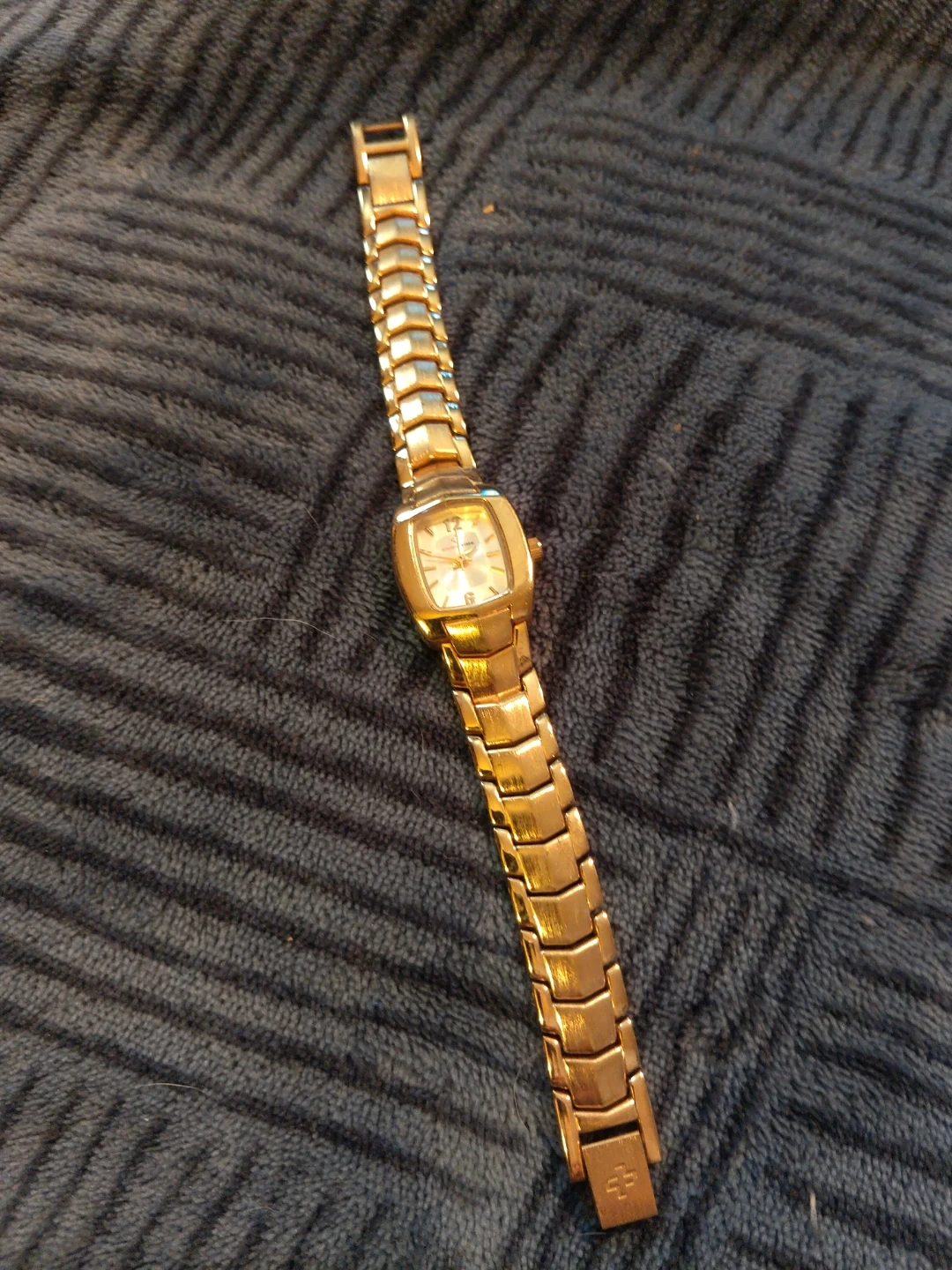 This is a women's gold tone Swiss Time watch. It's a classic accessory with a polished metal band. Water resistant.