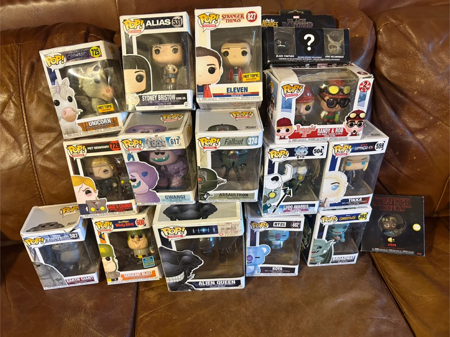 Selling a collection of Funko Pop! vinyl figures. Includes characters from various series like Stranger Things (Eleven, Lucas), Onward (Unicorn), Alias (Sydney Bristow), Fallout (Assaultron), and more! Also features special editions and exclusives. All figures are in their original boxes