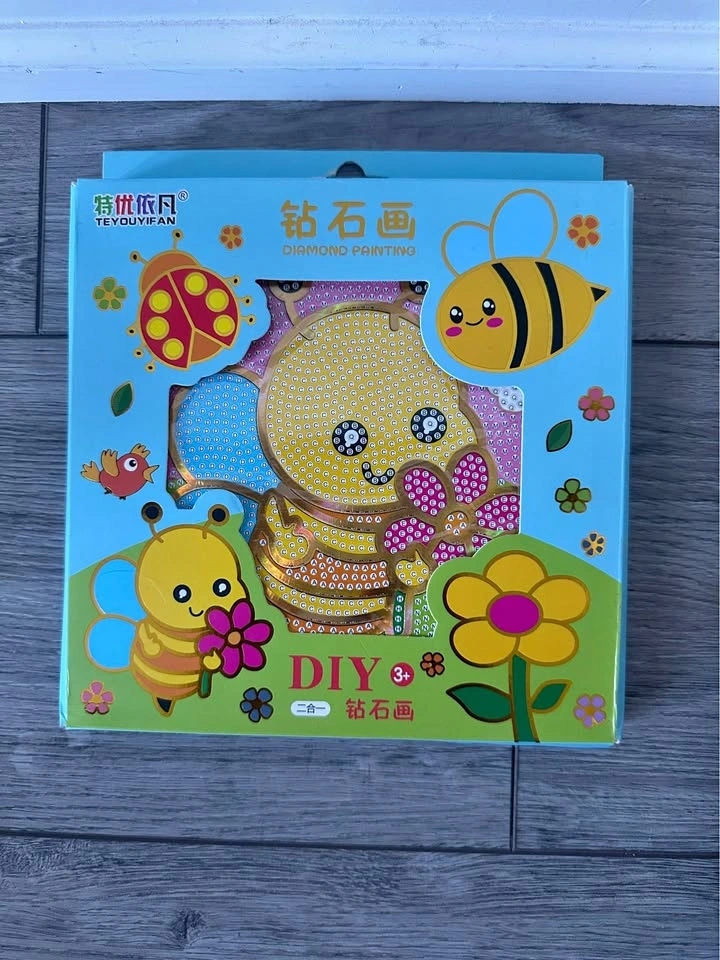 An engaging DIY diamond painting kit for kids to create their own sparkling artwork. Features kid-friendly illustrations like an elephant, bees, ladybugs, and flowers. Uses a letter/symbol-coded system for easy diamond placement, helping children develop focus and fine motor skills. Includes a frame or backing to display the finished masterpiece.