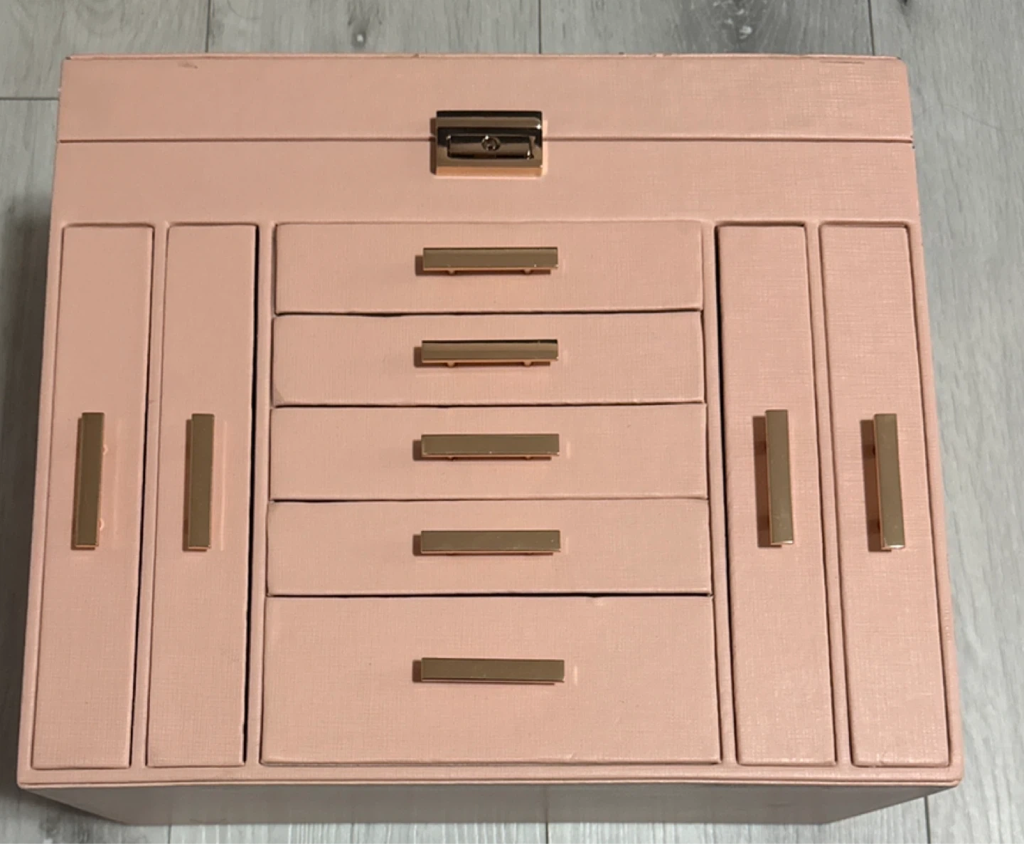 This pink jewelry box features multiple drawers and side compartments for organized storage. Gold-toned hardware accents the textured exterior. It's ideal for keeping your accessories tidy!