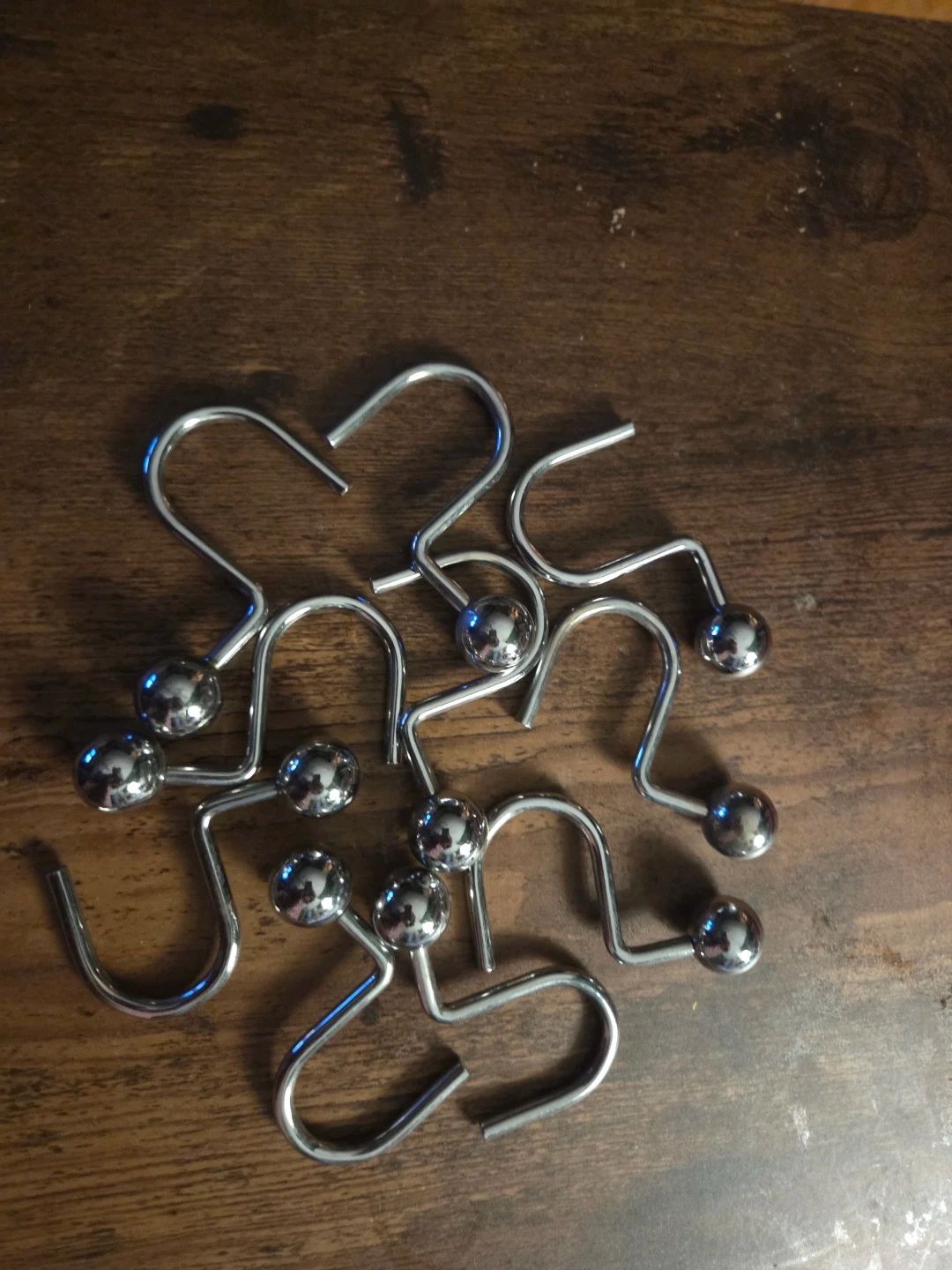 These shower curtain hooks are made of metal and feature a polished silver finish. They have a distinctive ball foot design. Set includes 12 hooks. Great for hanging shower curtains!