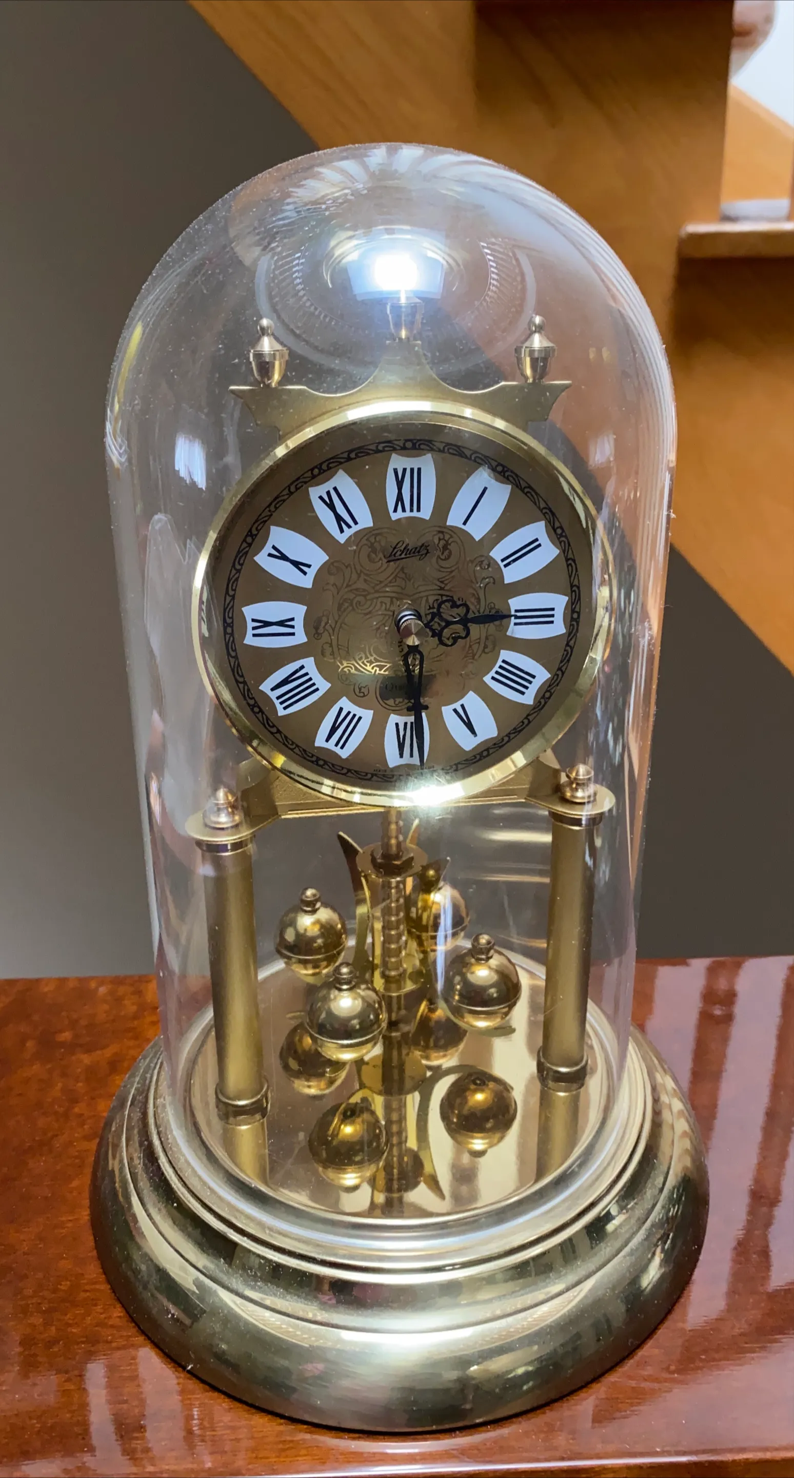 Selling a Schatz anniversary clock, complete with its glass dome. It's a beautiful timepiece that would look great in any home! The clock features a classic design with Roman numerals and a golden finish.