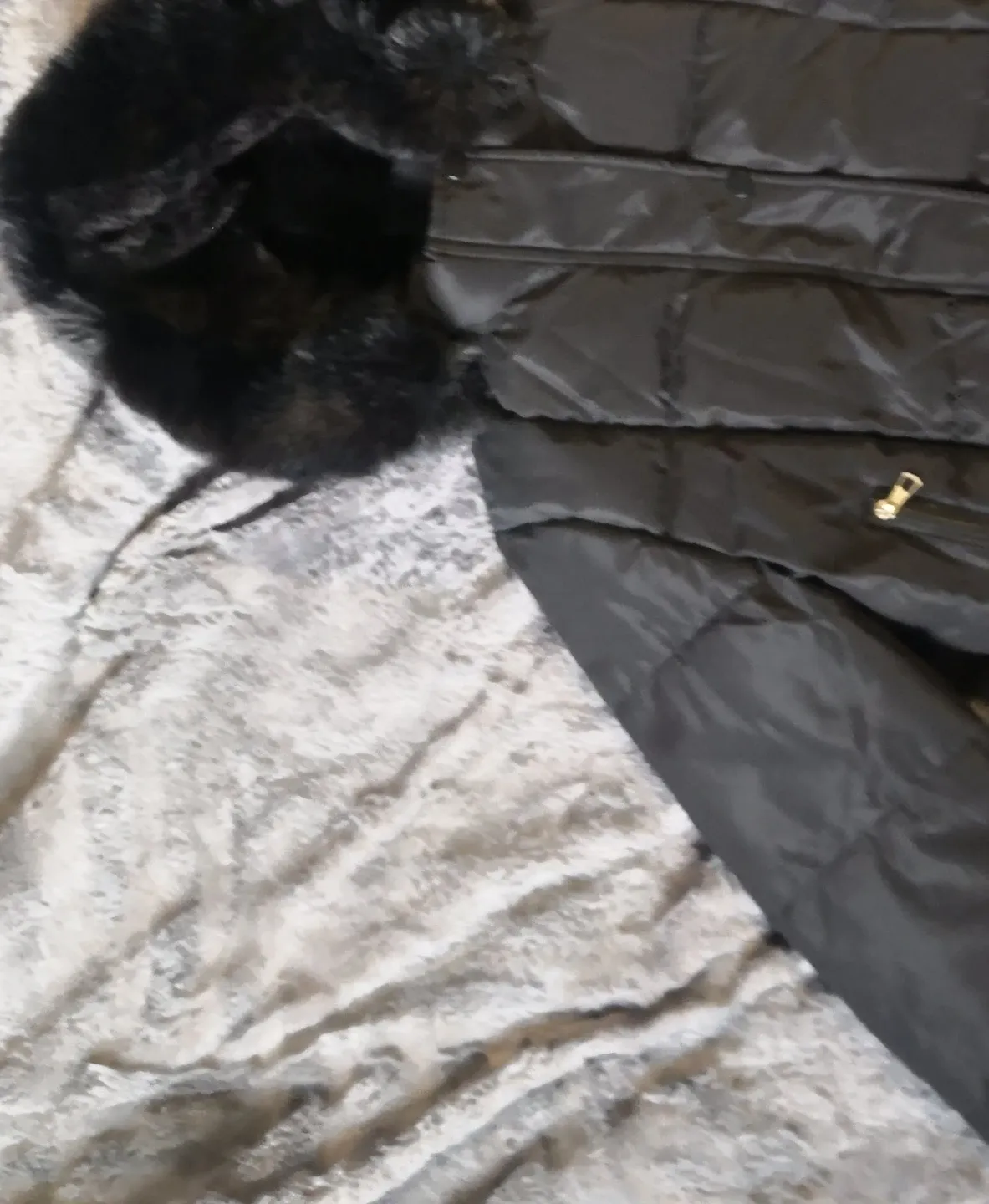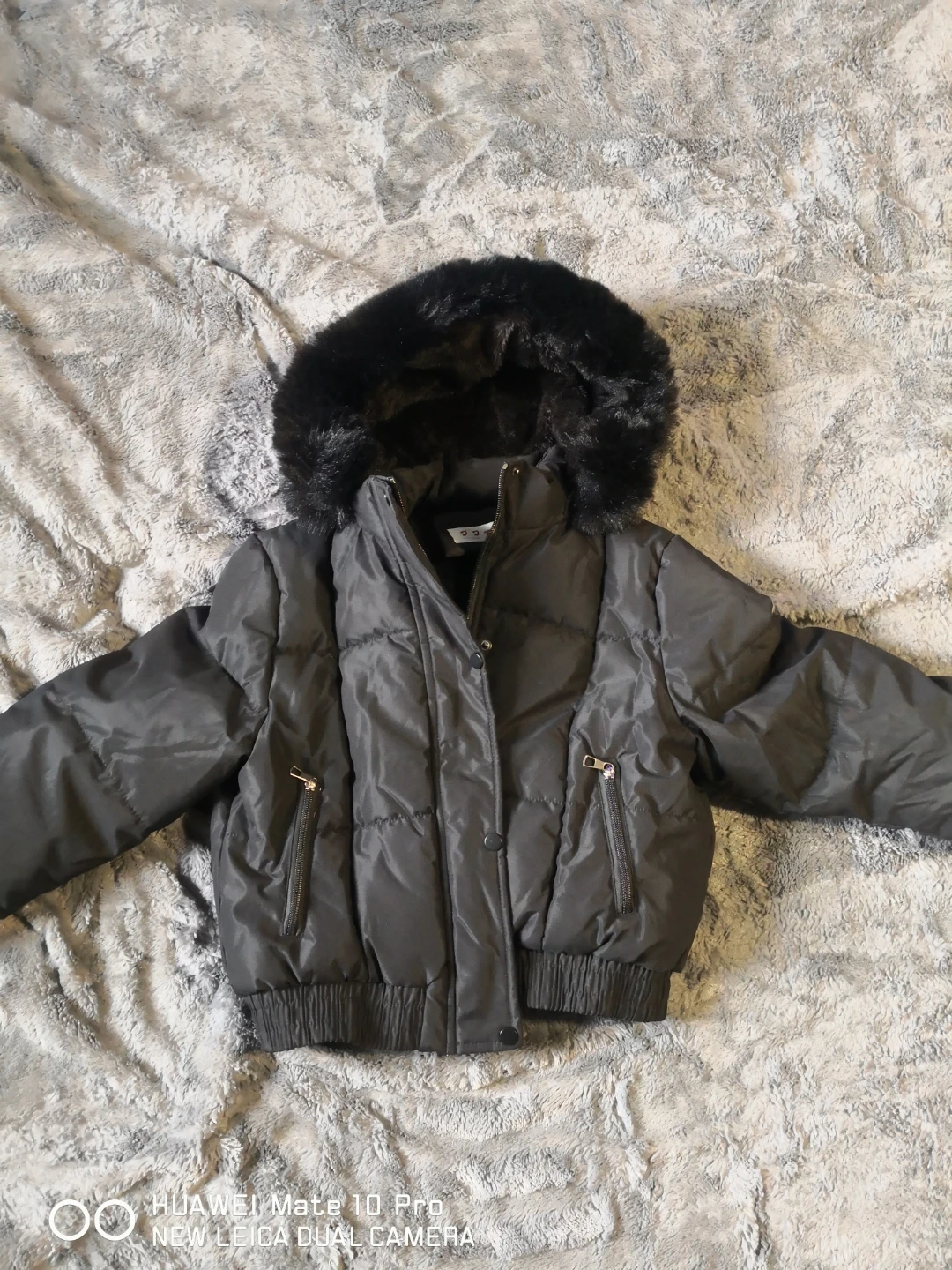 Cozy up in this black JJRS puffer jacket! It's a size large and features a faux fur hood. Perfect for staying warm and stylish during the colder months