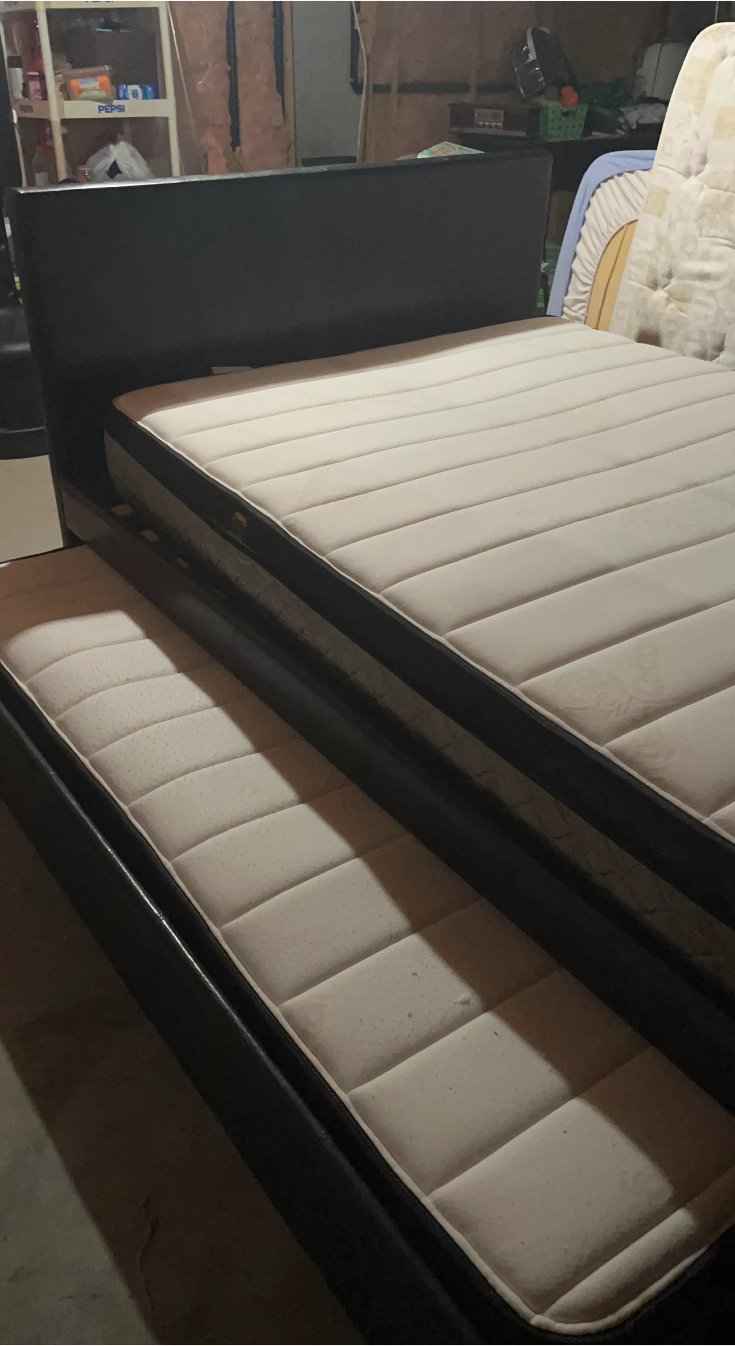 This black faux leather bed frame comes with a pull-out trundle, perfect for sleepovers. The mattresses are quilted for comfort. It's a full -sized bed with an included trundle.