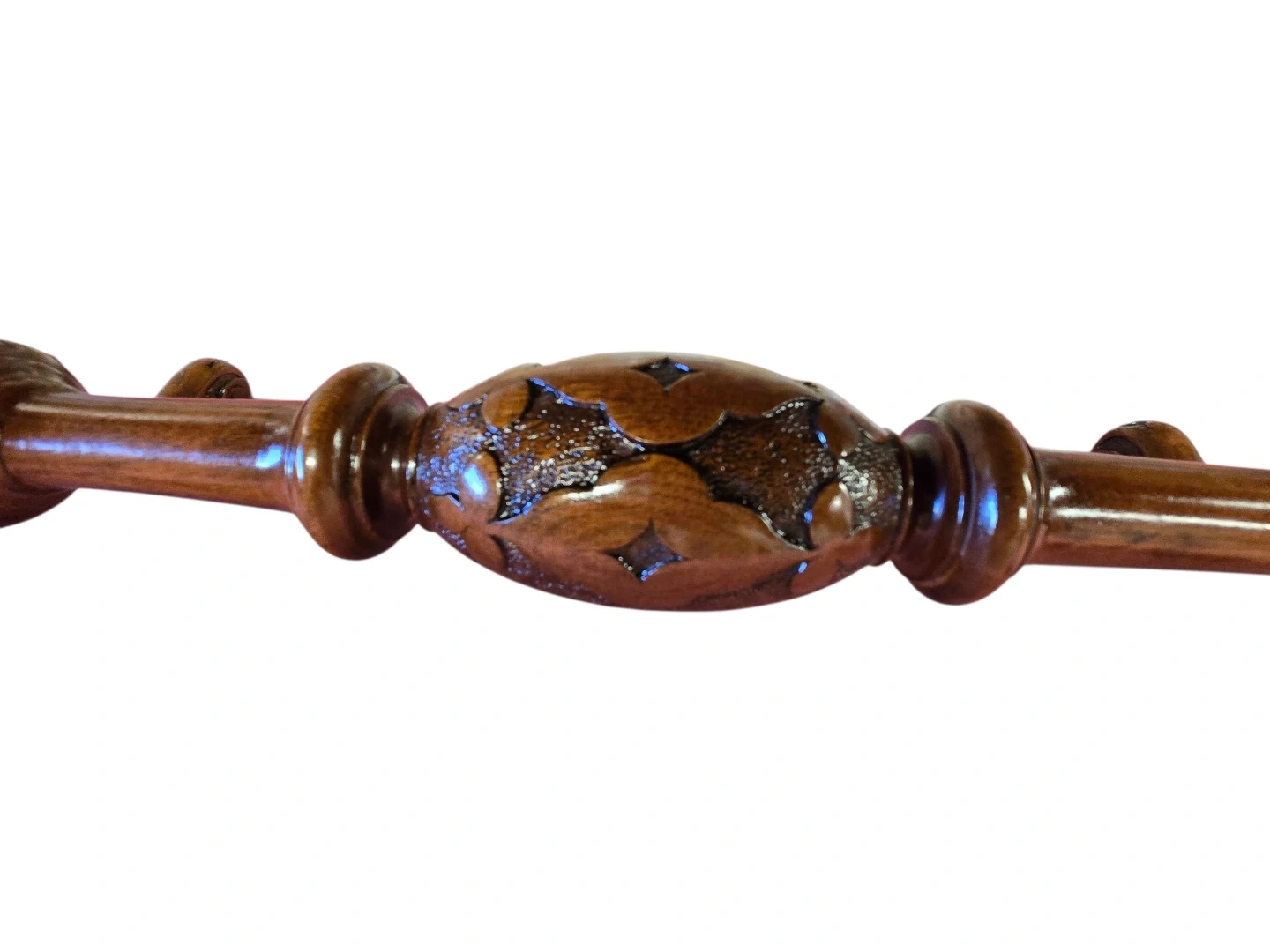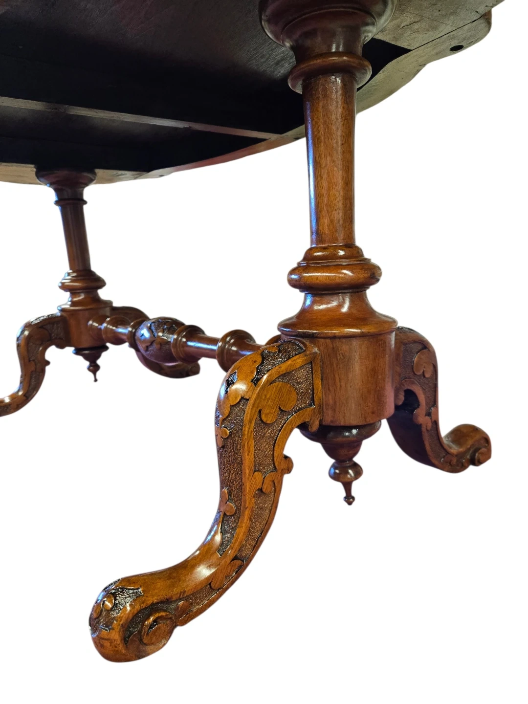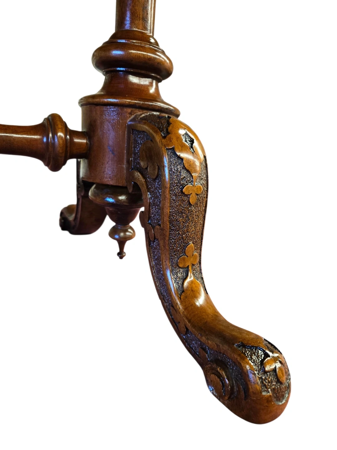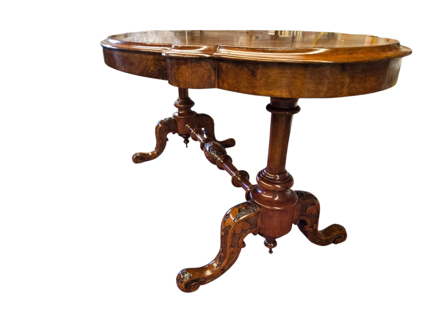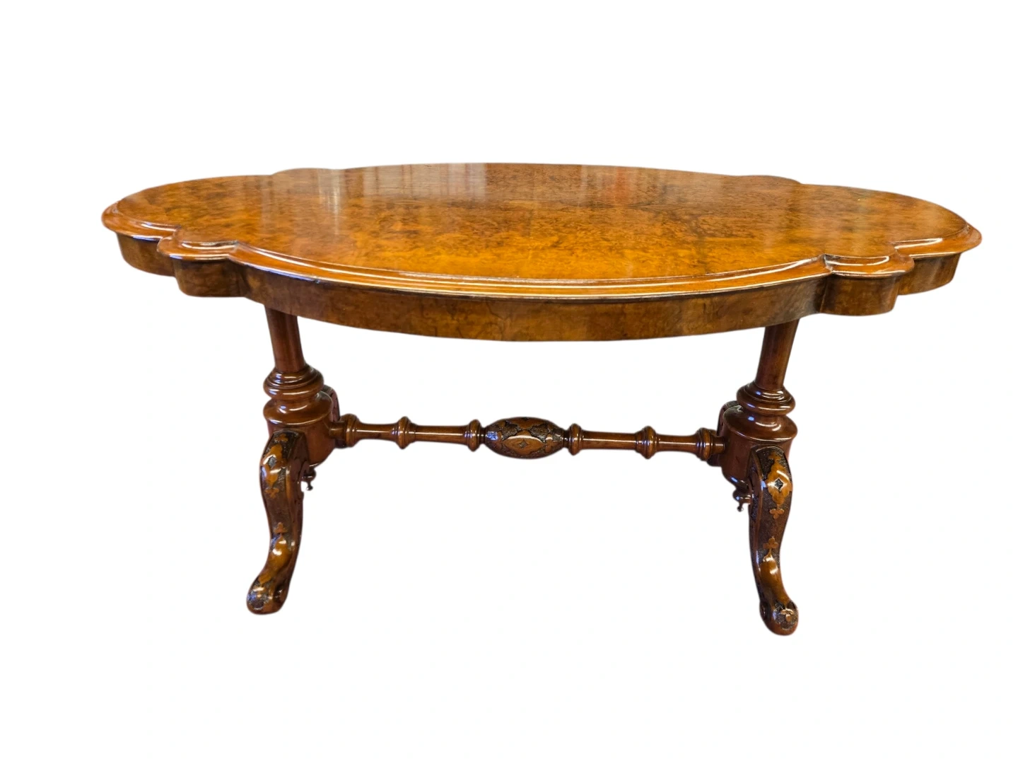This is a charming antique side table. It's made from rich walnut burr wood with a beautiful patterned inlay on the top. The table features ornate carved legs and a central stretcher for stability. It'd make a lovely addition to any room!