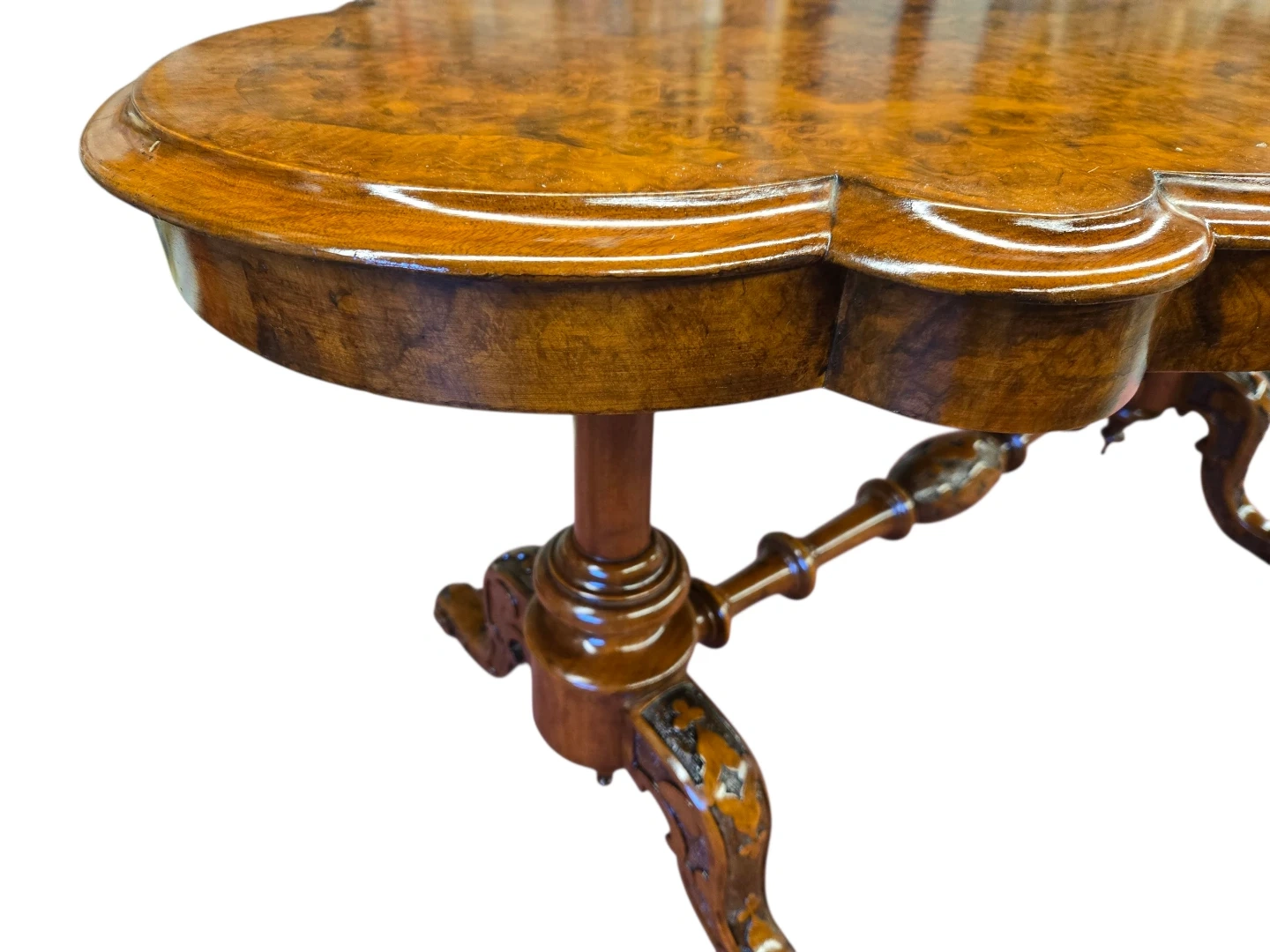 This is a charming antique side table. It's made from rich walnut burr wood with a beautiful patterned inlay on the top. The table features ornate carved legs and a central stretcher for stability. It'd make a lovely addition to any room!