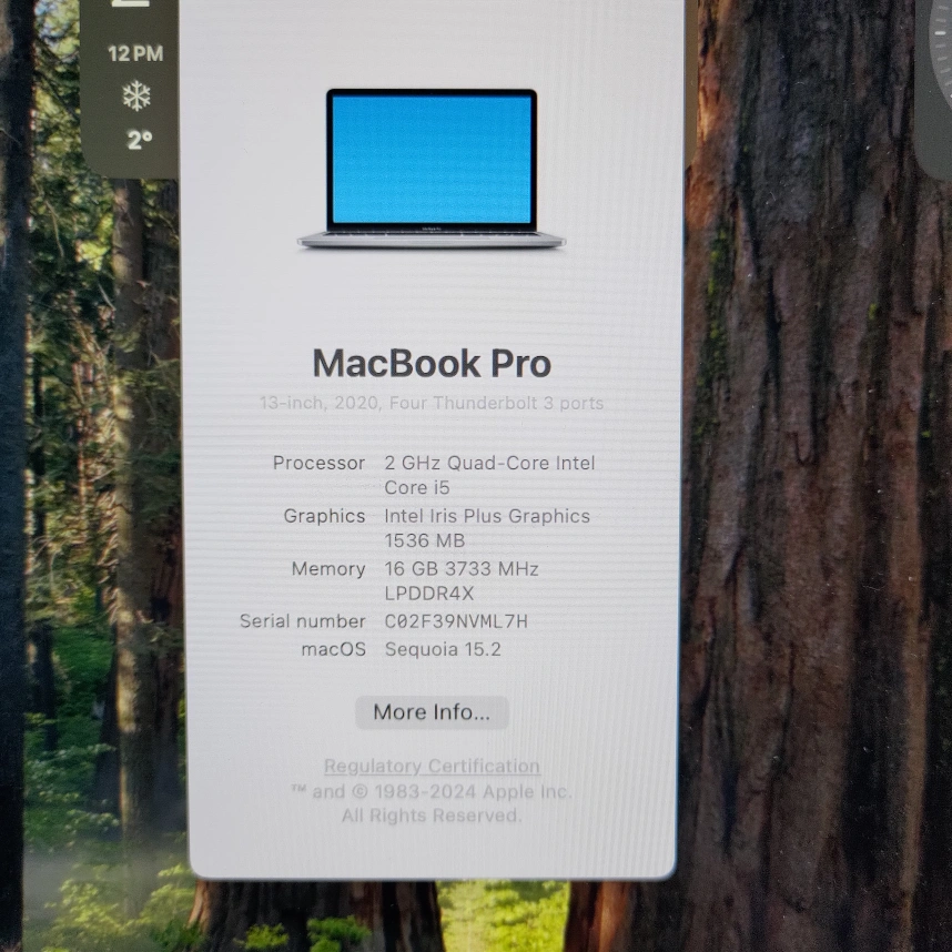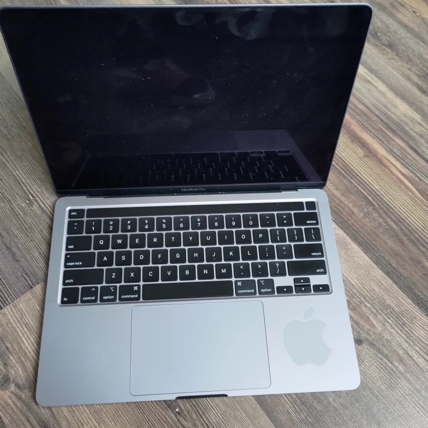 MacBook Pro, 13-inch model from 2020. Features Intel Core i5 processor, Iris Plus Graphics, and 16 GB memory. Includes four Thunderbolt 3 ports. Pre-owned.