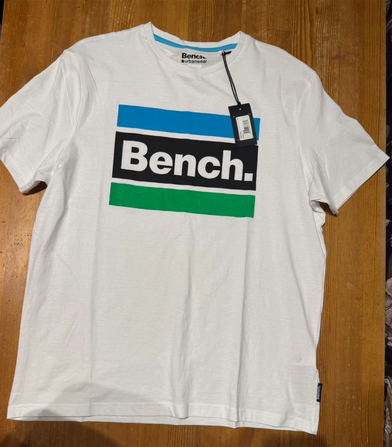 White Bench. t-shirt with a bold logo graphic across the chest. It's made of comfortable material. A great staple piece for casual wear!