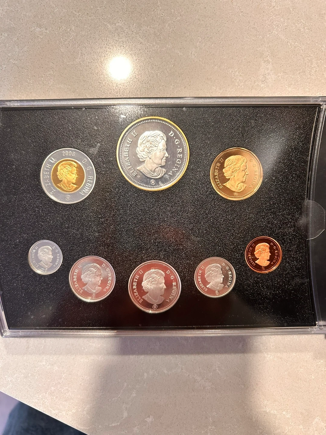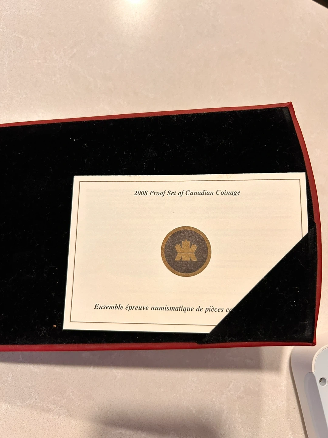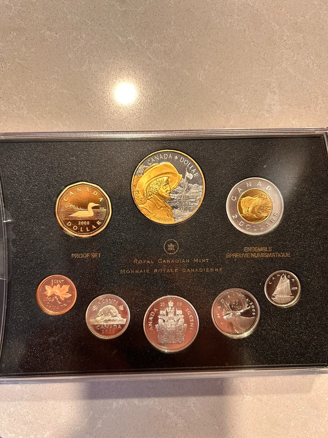 This is the 2008 Proof Set of Canadian Coinage. Collectors Item, every coin is in mint condition except for the proof dollar, which has very minimal rusting on it. The plastic case has never been opened.