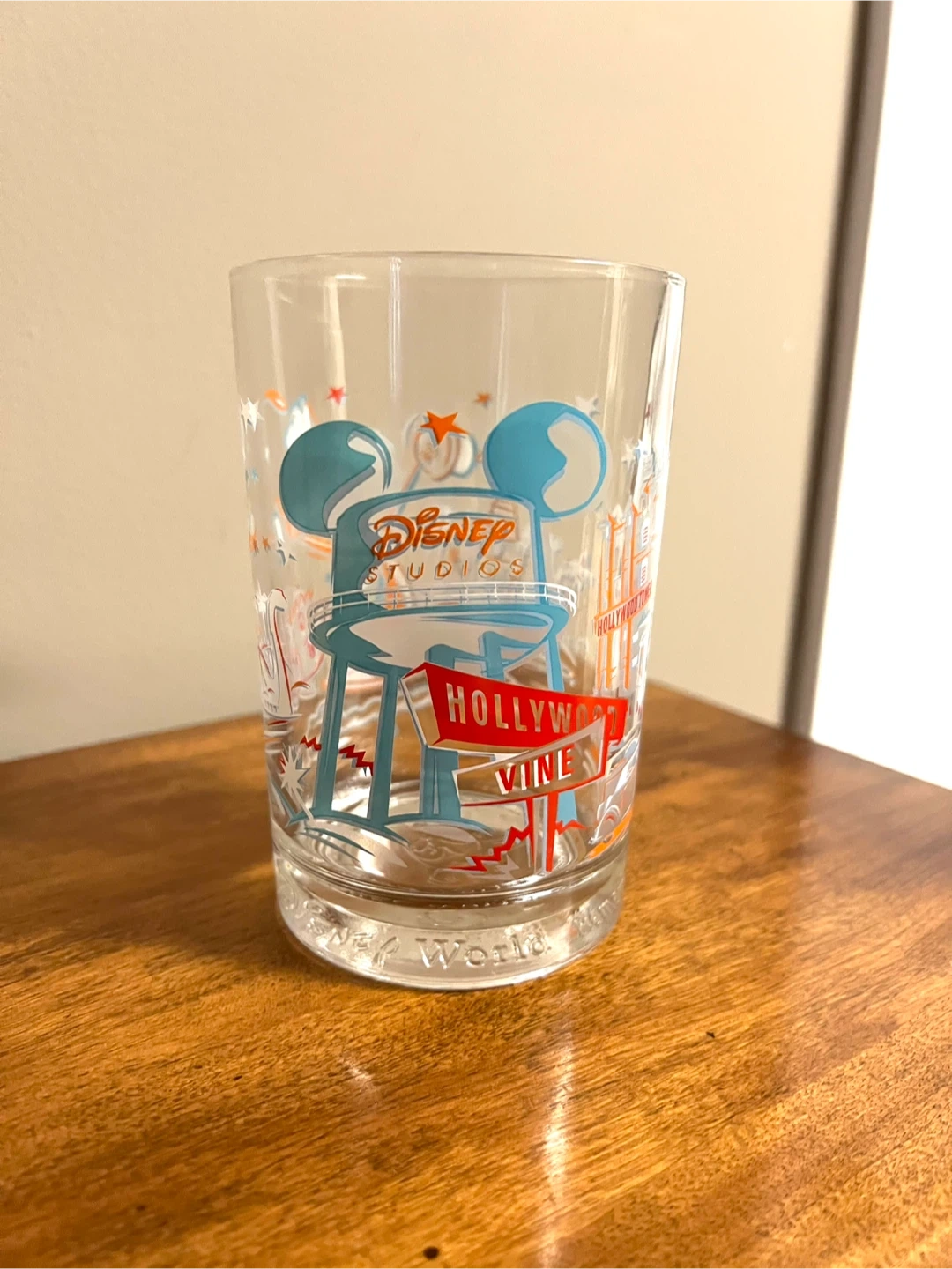 Vintage glass featuring Disney Studios Hollywood Vine design. It's made of clear glass with colourful graphics. This would be great for a Disney collector!