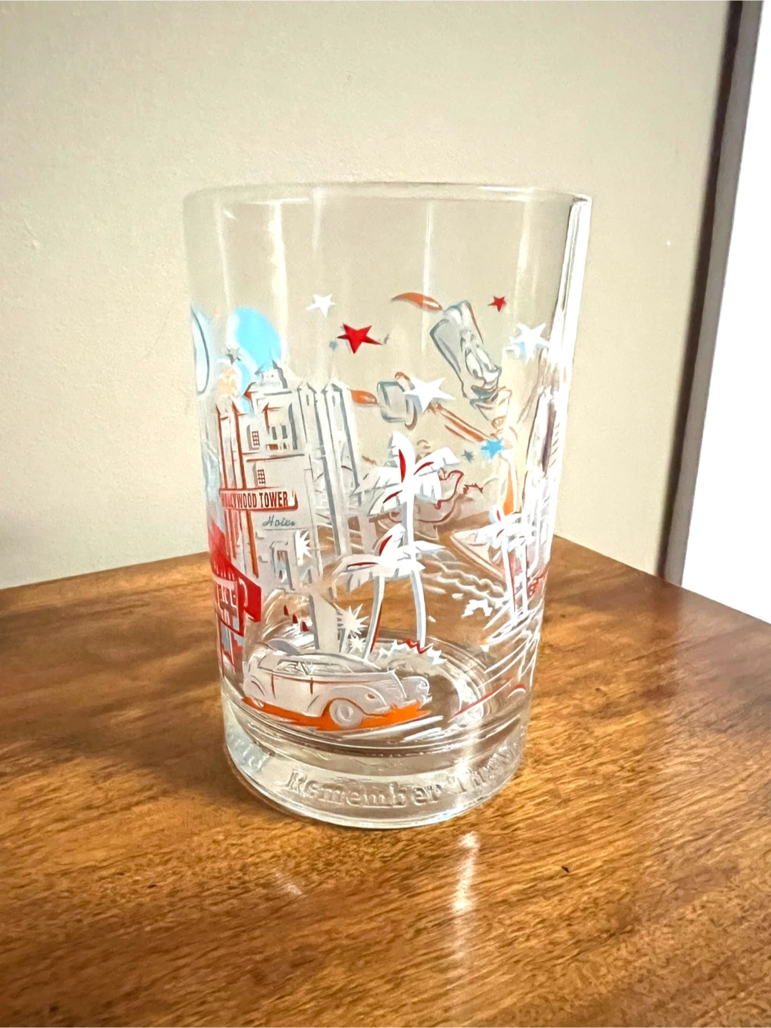 Vintage glass featuring Disney Studios Hollywood Vine design. It's made of clear glass with colourful graphics. This would be great for a Disney collector!