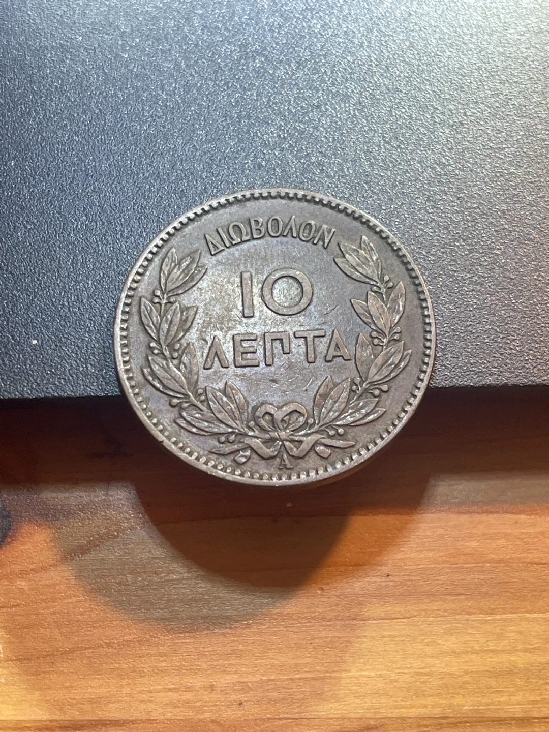 This is a Greek 10 Lepta coin from 1882. The coin features a portrait of a man on one side and a laurel wreath with the denomination on the other. It's a collector's item for numismatists interested in historical currency.