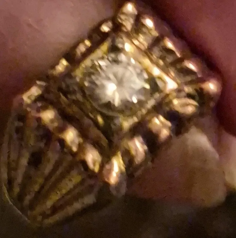 This ring features a central diamond-style stone set in a gold-tone metal. The band has an intricate, carved design. It's a classic engagement or statement piece.