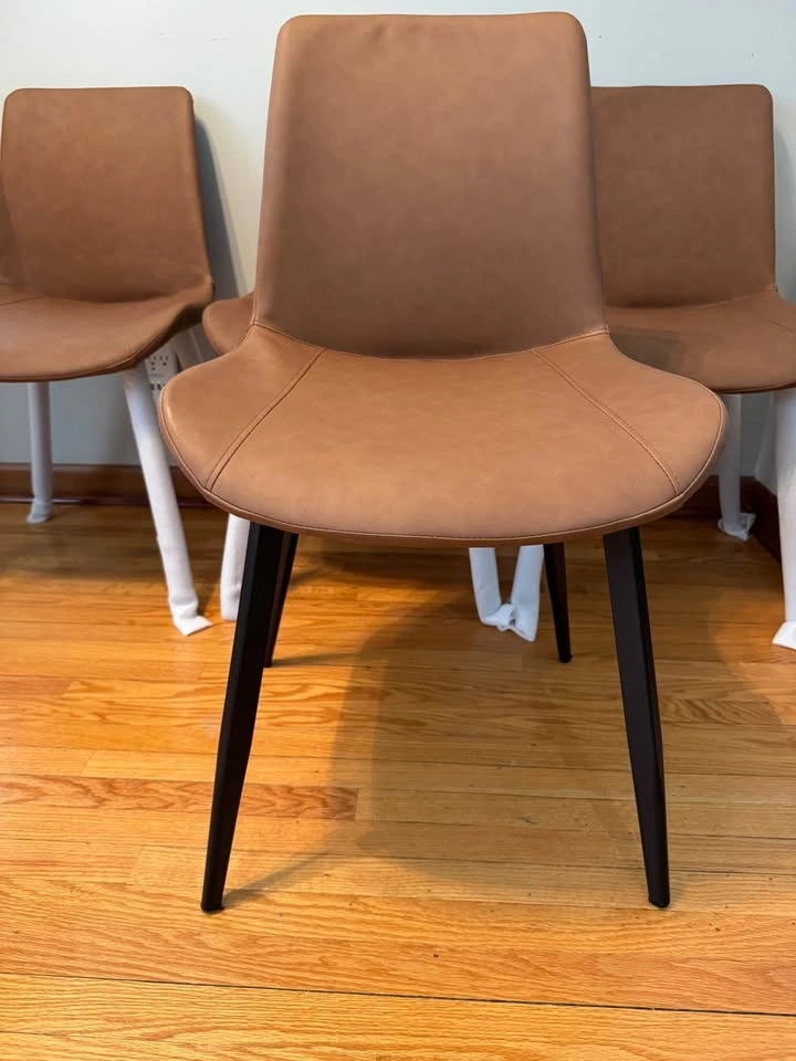Set of 4 modern dining chairs with brown faux leather seats and black metal legs. Clean simple look that works well with most tables. Brand new – just unboxed to make sure all parts and pieces were present and nothing was broken. Pickup in Winnipeg.