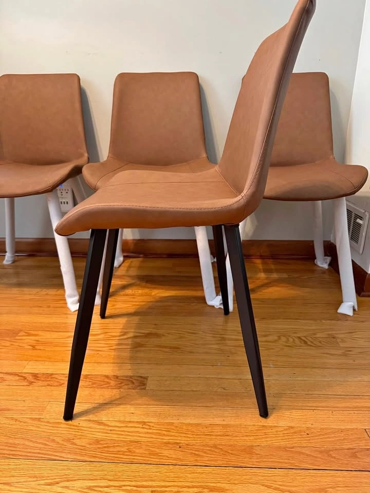 Set of 4 modern dining chairs with brown faux leather seats and black metal legs. Clean simple look that works well with most tables. Brand new – just unboxed to make sure all parts and pieces were present and nothing was broken. Pickup in Winnipeg.