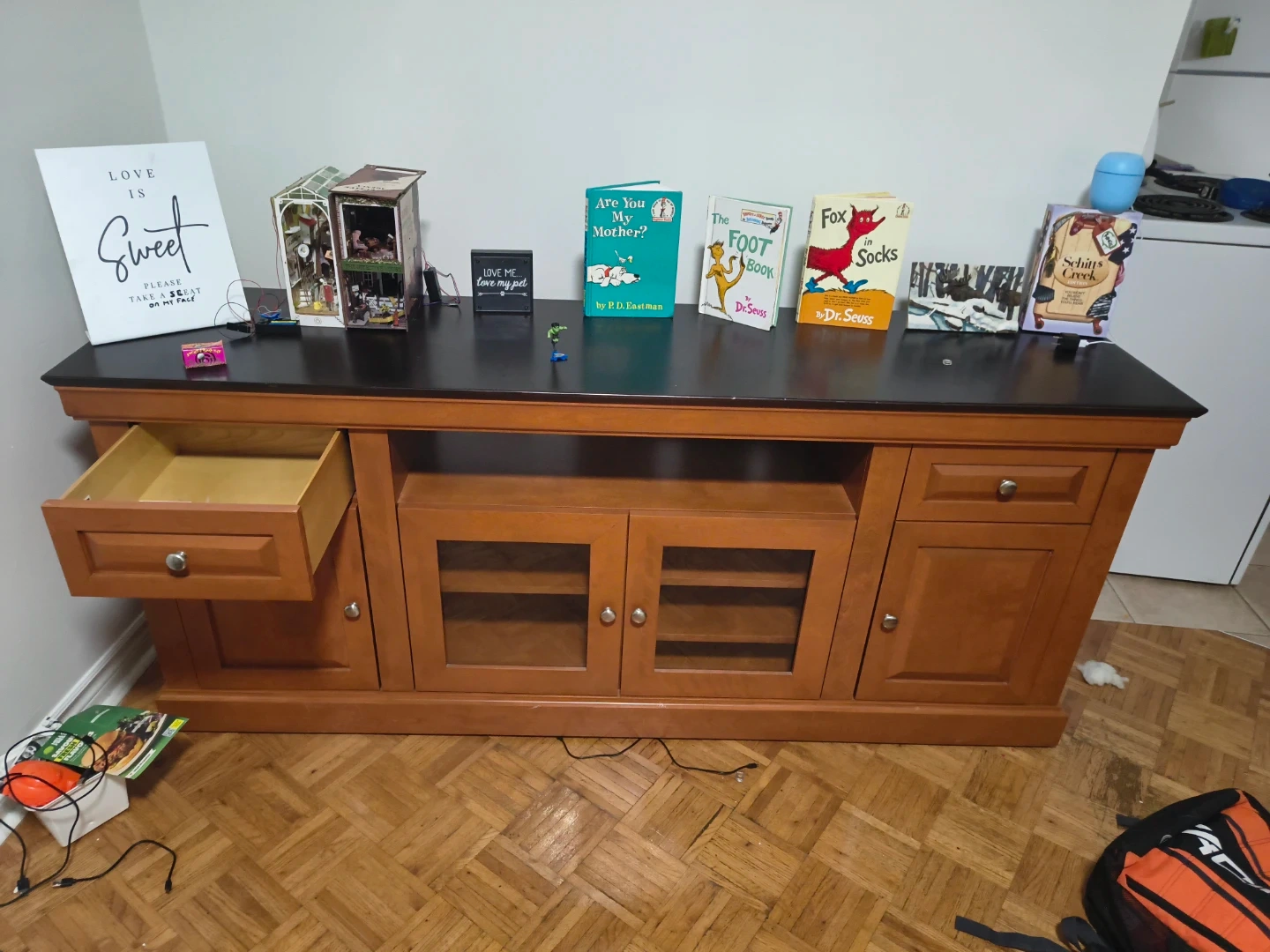 Selling a used wooden TV stand, perfect for adding storage and style to your living room! It features drawers, cabinets with glass doors, and open shelving. Great for organizing media consoles, books, and decor, it's a versatile piece for any home has one or two visible scratches but is brand new bought it for my apartment last week took the shrink wrap off myself.