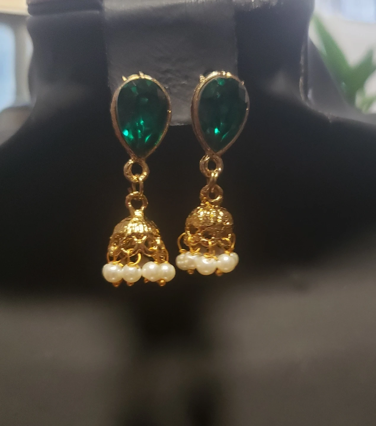 These jhumka earrings feature a gold-toned finish. Each earring has a green teardrop-shaped gem at the top, followed by a bell-shaped jhumka adorned with small pearls. They're a lovely statement piece for many occasions.