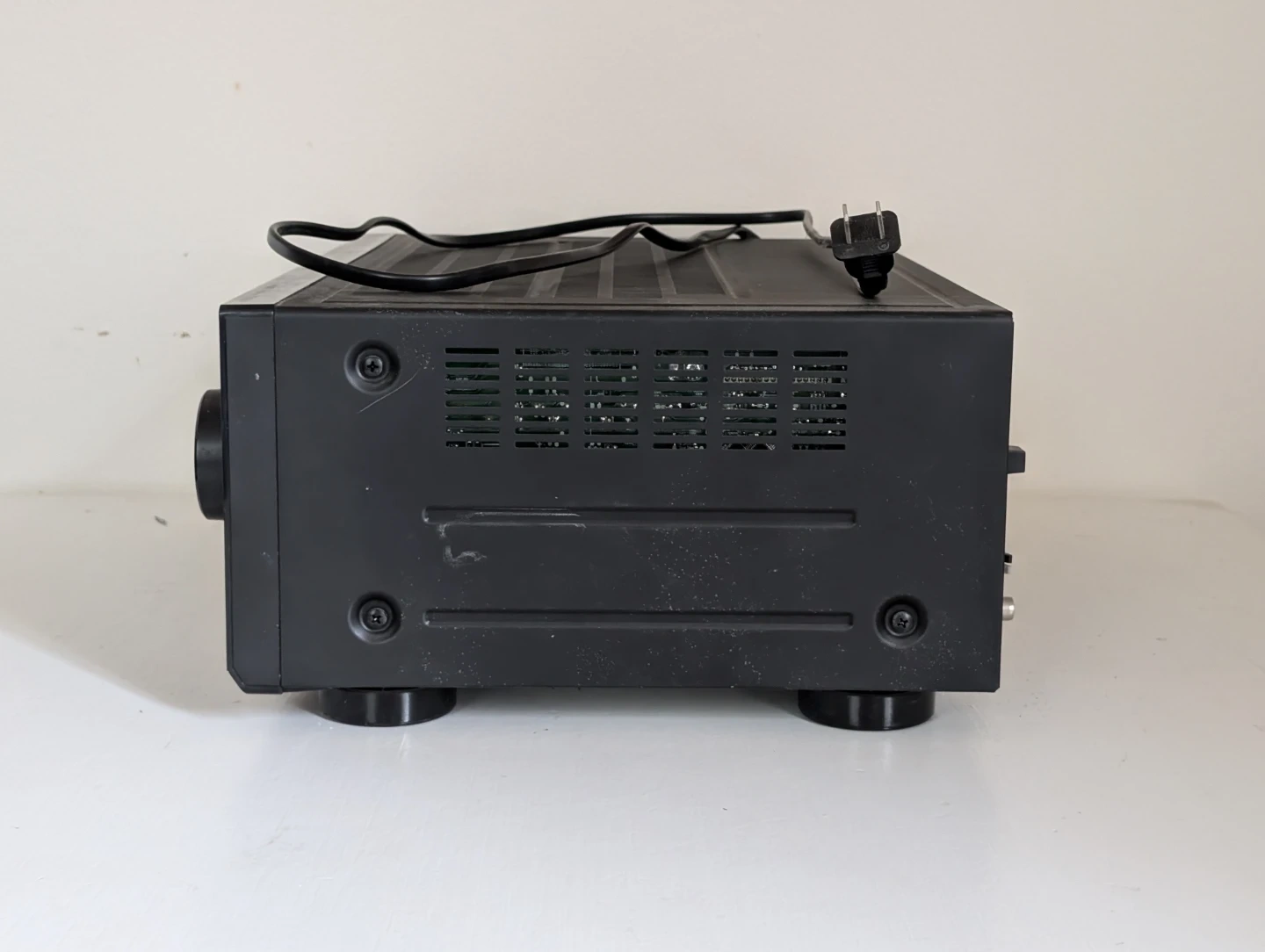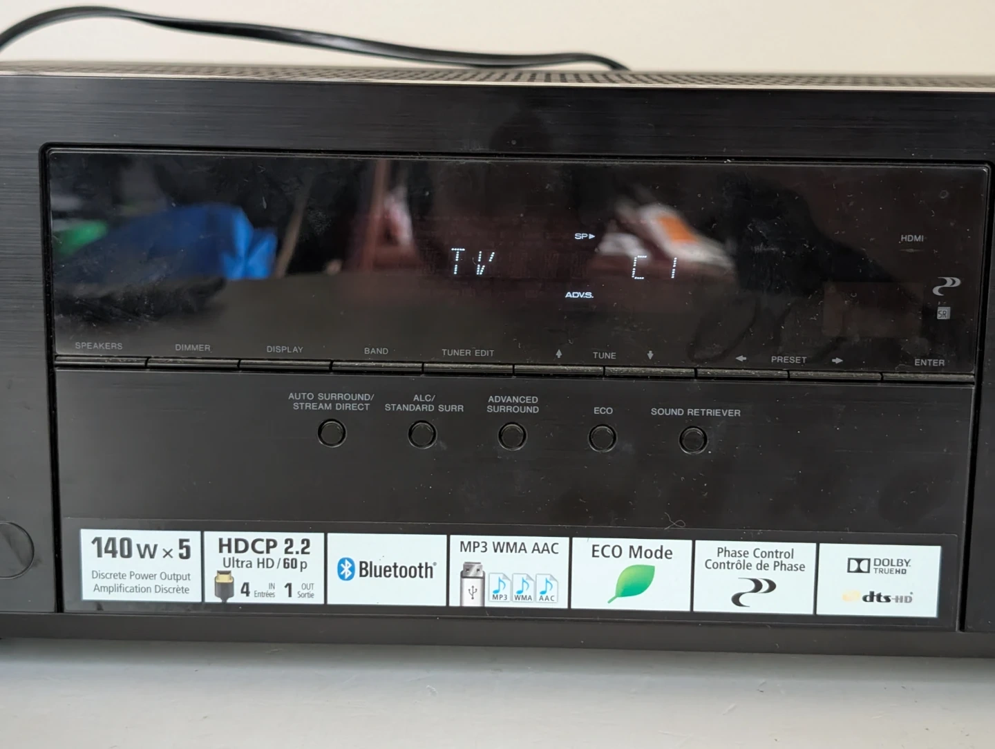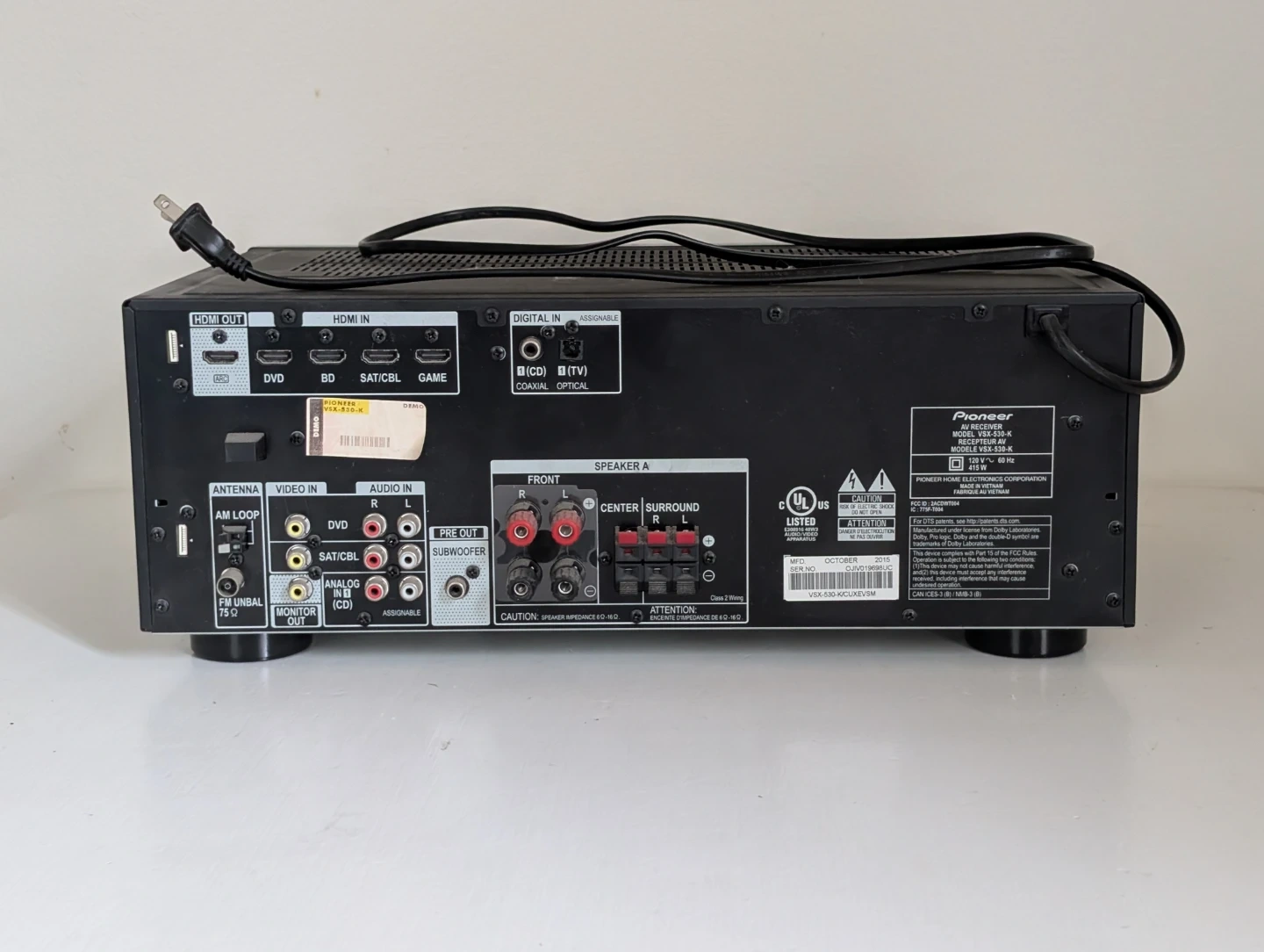 Pioneer VSX-530 AV receiver and remote control included. It's black and supports 140W x 5 discrete amplification. It also has HDCP 2.2, Bluetooth, MP3 WMA AAC, and ECO Mode. This receiver is great for setting up a home theatre system.