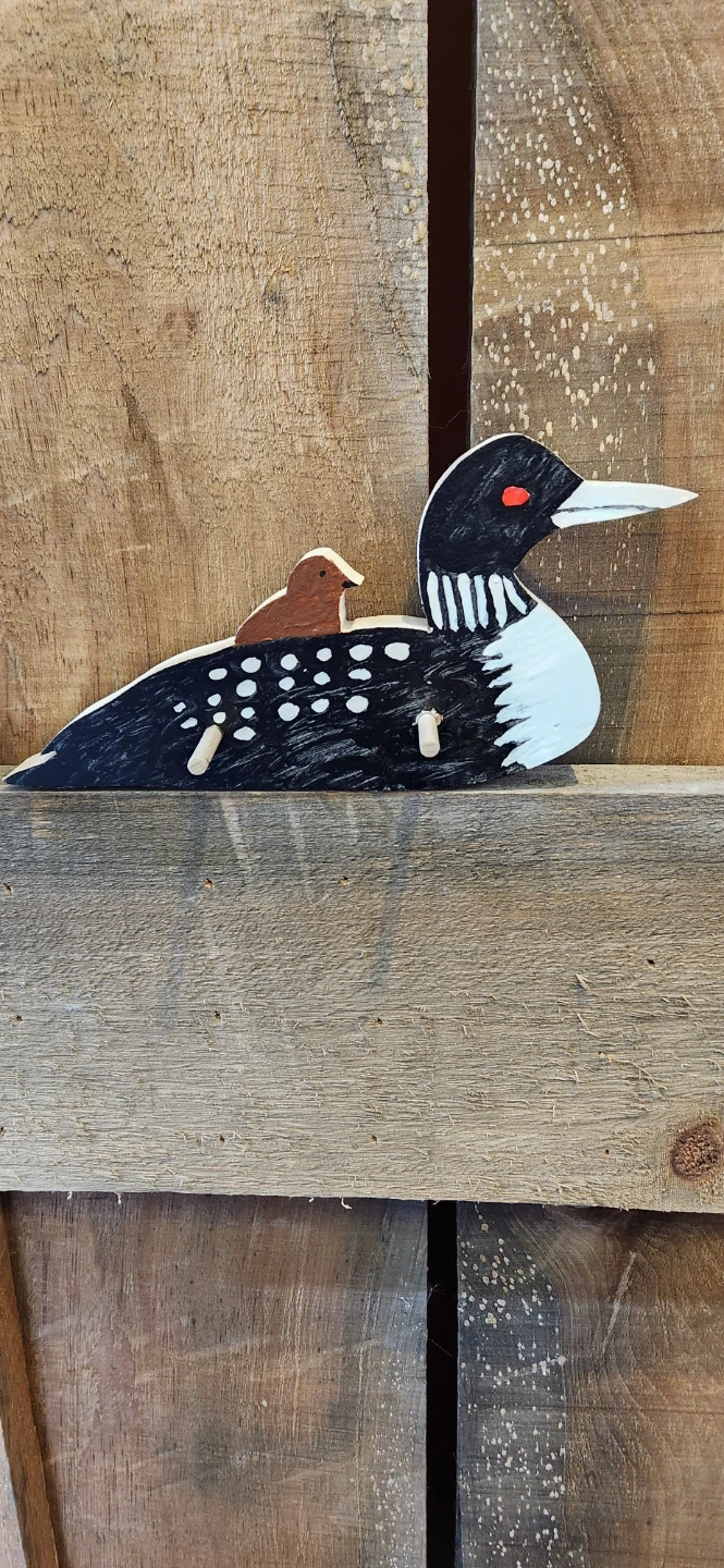 Key Holder A charming wooden decoration featuring a loon with a baby bird on its back. It's painted with black, white, and grey details and has red eyes. This piece would make a lovely addition to a cabin or cottage decor.