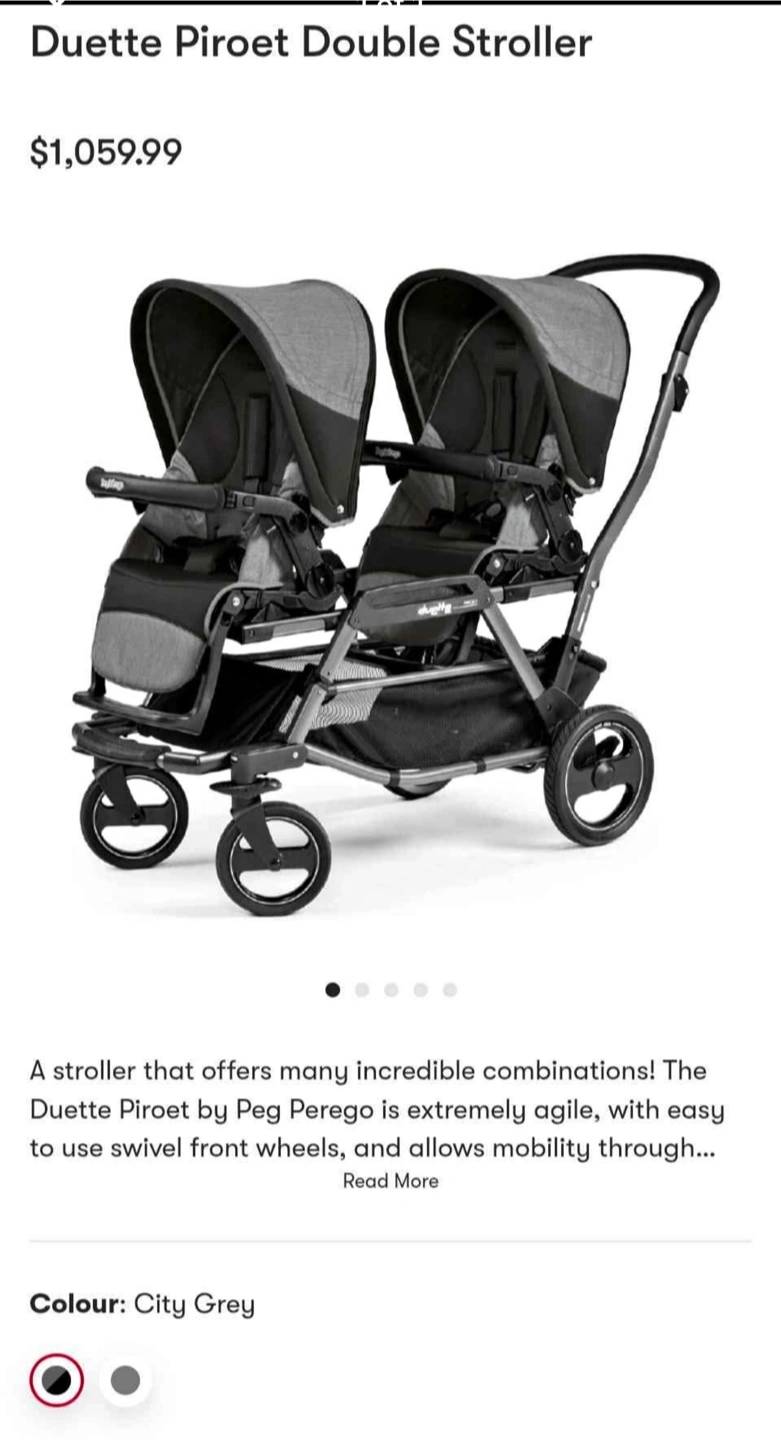 Double stroller with two seats. Features a black frame with grey fabric. The stroller has swivel front wheels, and very big storage basket. It's a nice way to make errands feel like a walk in the park.