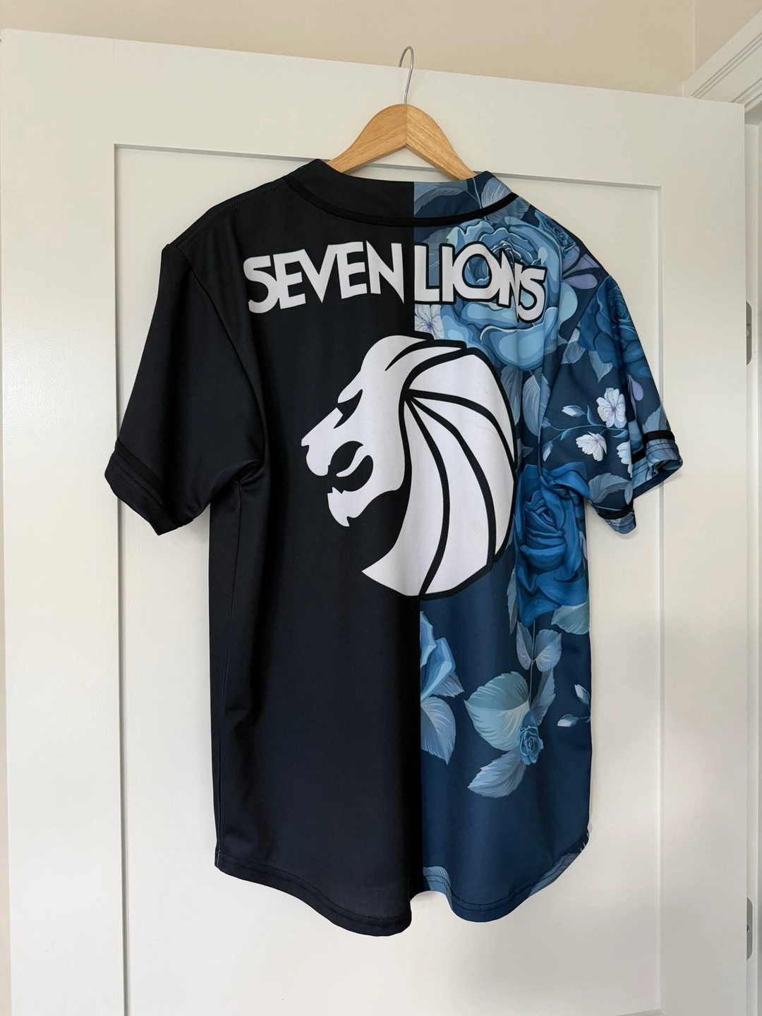 Selling a Seven Lions baseball jersey by Rave Bonfire Apparel. Excellent condition, used once. Retails $75-80. Size M. Features a split design with blue roses floral print on the left and solid black on the right. Seven Lions logo on chest and back with lion graphic. Made of 100% recycled polyester, it's lightweight and breathable. Perfect for EDC, festivals, raves, or everyday wear. From a smoke-free home. Clearing out before a move. Pickup in Murray Hill.