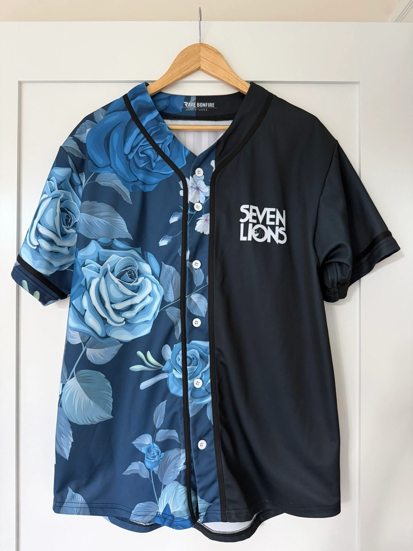 Selling a Seven Lions baseball jersey by Rave Bonfire Apparel. Excellent condition, used once. Retails $75-80. Size M. Features a split design with blue roses floral print on the left and solid black on the right. Seven Lions logo on chest and back with lion graphic. Made of 100% recycled polyester, it's lightweight and breathable. Perfect for EDC, festivals, raves, or everyday wear. From a smoke-free home. Clearing out before a move. Pickup in Murray Hill.