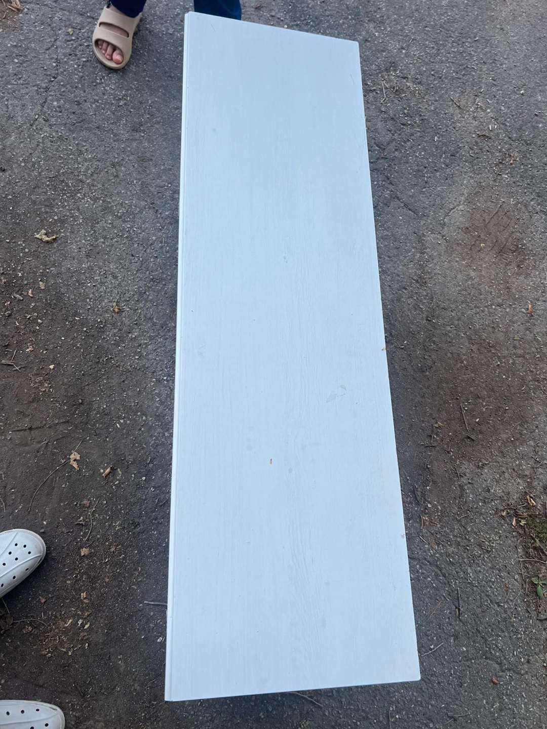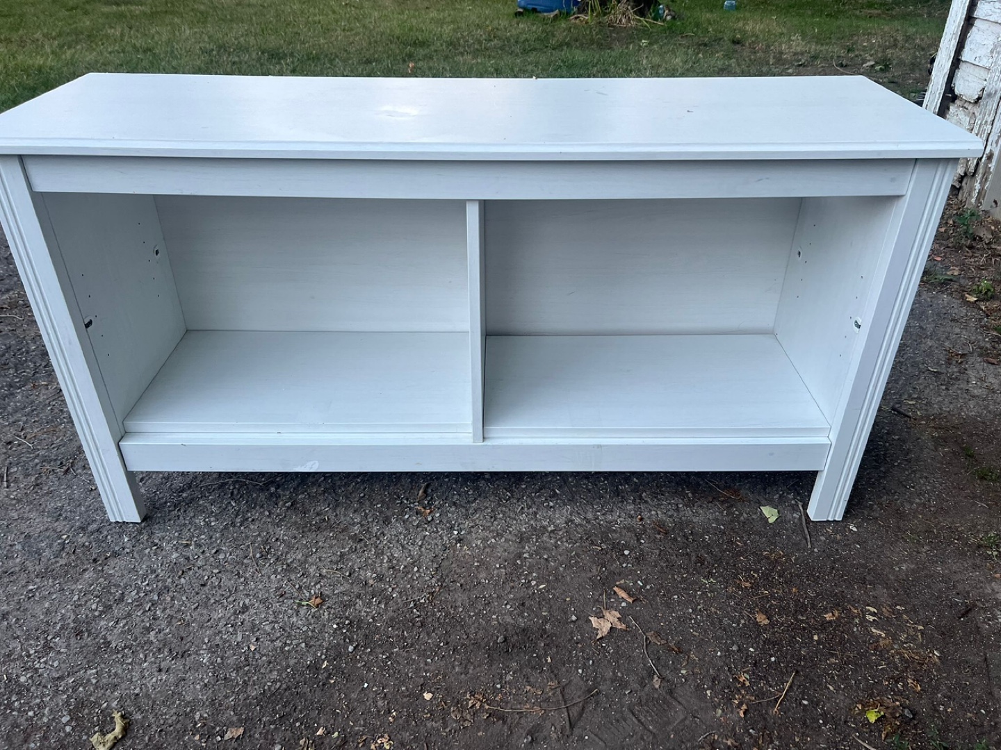 Selling a white wooden shelf unit. It's in good condition and would be great for storage or display. It has two shelves and a top surface. It's a sturdy piece of furniture.