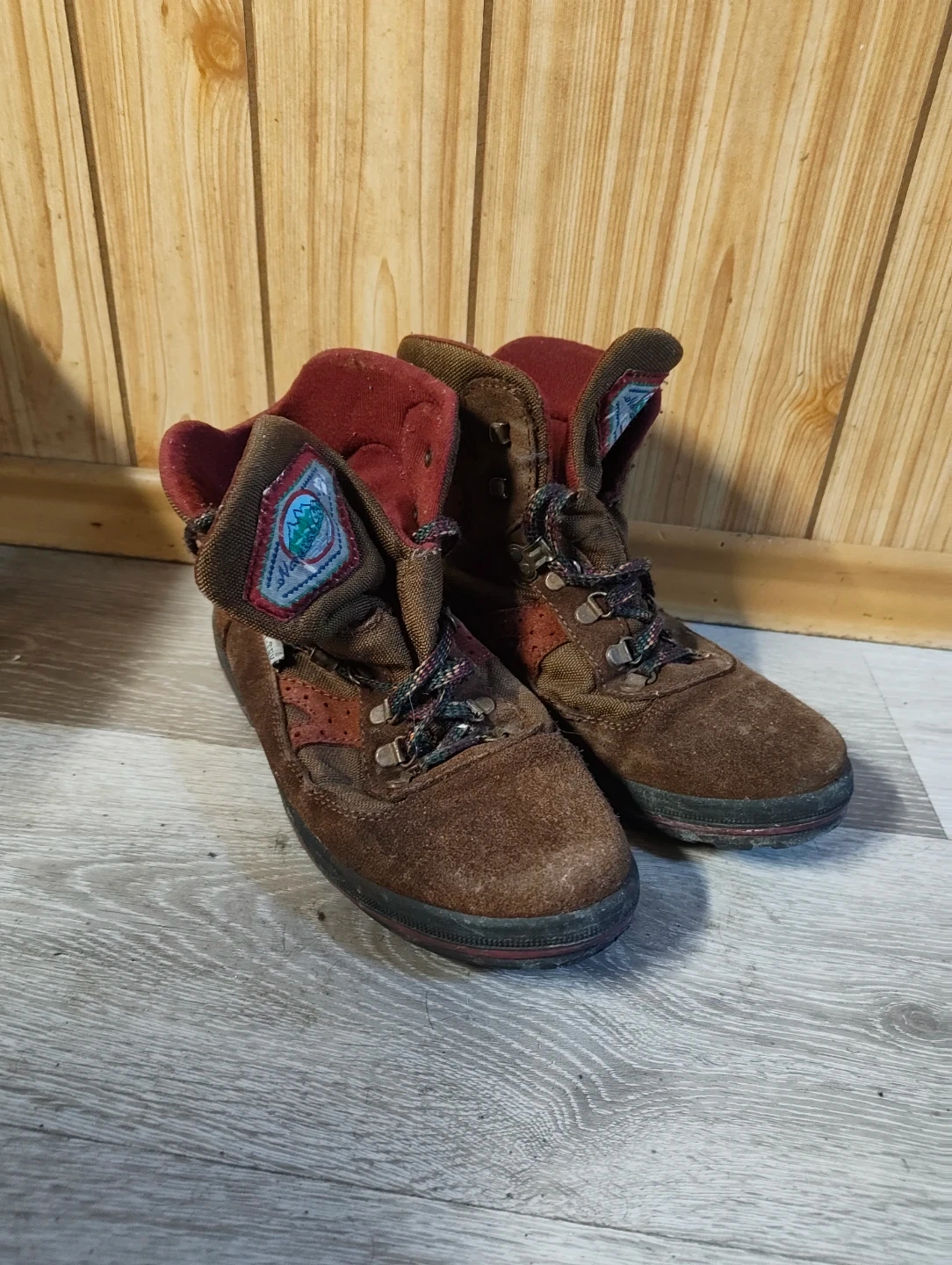 A pair of brown suede hiking boots. They feature a sturdy construction with red accents and patterned laces. These boots are great for hitting the trails!