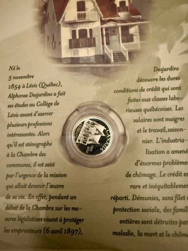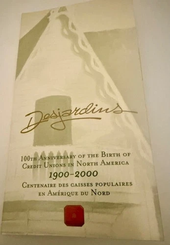 This is a 2000 Canada 10-Cent Sterling Silver commemorative coin issued by the Royal Canadian Mint for the 100th Anniversary of Credit Unions in North America, associated with Alphonse Desjardins. The coin is 92.5 percent sterling silver and remains in its original Royal Canadian Mint cardboard presentation, exactly as issued. It has never been removed from the holder and has been stored carefully since purchase. The presentation includes the original bilingual informational booklet. All original components shown in the photos are included. Some light glare may be visible in photos due to the coin’s proof style and protective casing; this is normal for reflective silver coins and does not affect the condition.