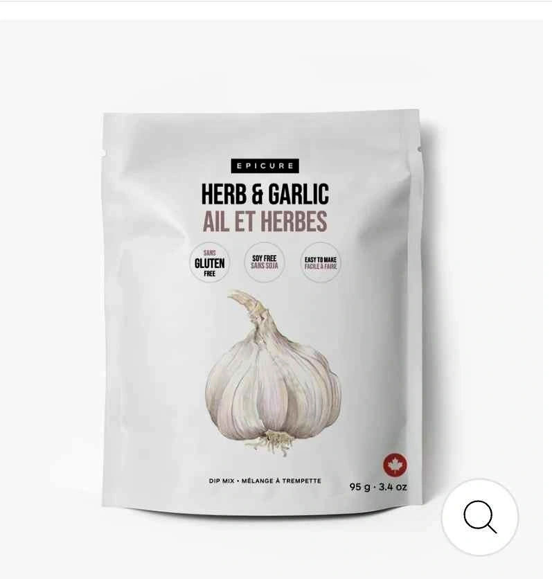 New Epicure Herb & Garlic Dip Mix. This dip mix is gluten free and soy free. Super easy to make. Pouch has 95g (3.4 oz). Good for snacks or parties! Gluten free Nut Free Non-GMO Vegan Dairy Free Soy Free. This versatile blend of chives, parsley and garlic is perfect to easily make creamy dip and garlic butter, toss with olive oil on hot pasta, make mashed potatoes and season meatloaf, roasted veggies, pasta sauces and burgers.