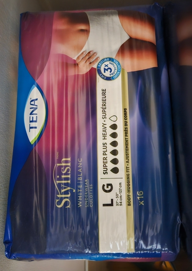 Selling a TENA Stylish White Underwear Culottes in size Large. The packaging indicates they fit a waist size of 37"-50" (94 cm-127 cm). They are Super Plus Heavy absorbency and have a body-hugging fit. The pack contains 16 culottes.