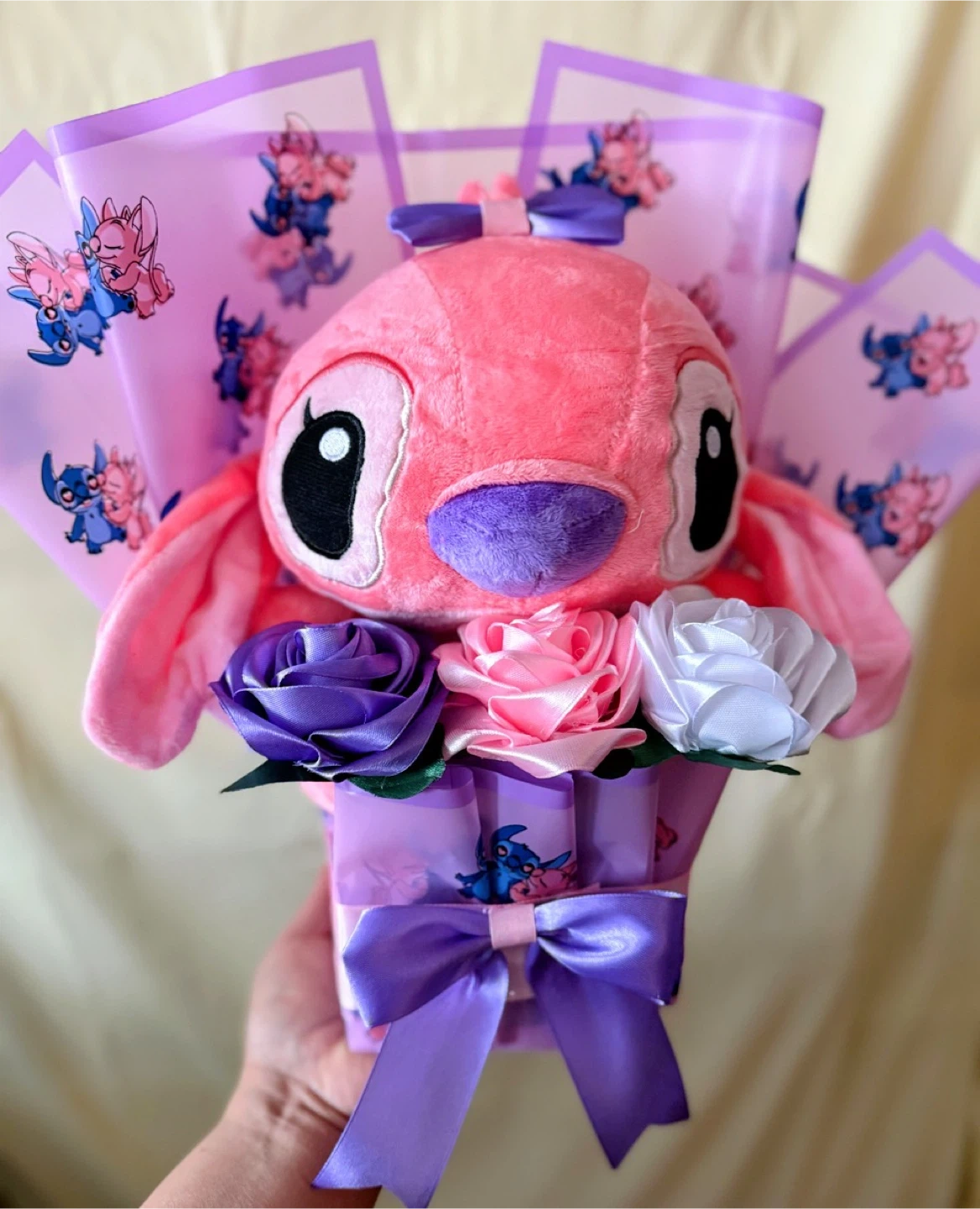 This adorable bouquet features a plush Angel character from Disney's Lilo & Stitch. It's adorned with faux silk roses in purple, pink, and white, and wrapped in themed paper with a purple ribbon and bow. It's a fun gift for any fan!