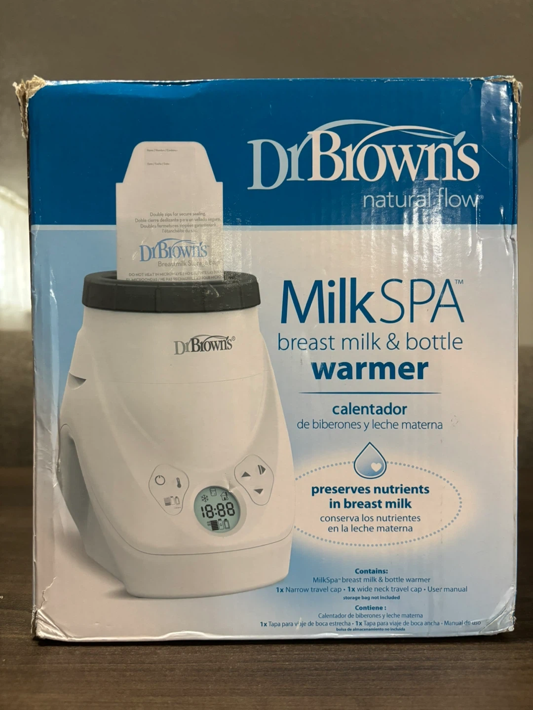 Dr. Brown's natural flow Milk SPA breast milk & bottle warmer. It preserves nutrients in breast milk. Includes the warmer, 1x narrow travel cap, 1x wide neck travel cap, and user manual.