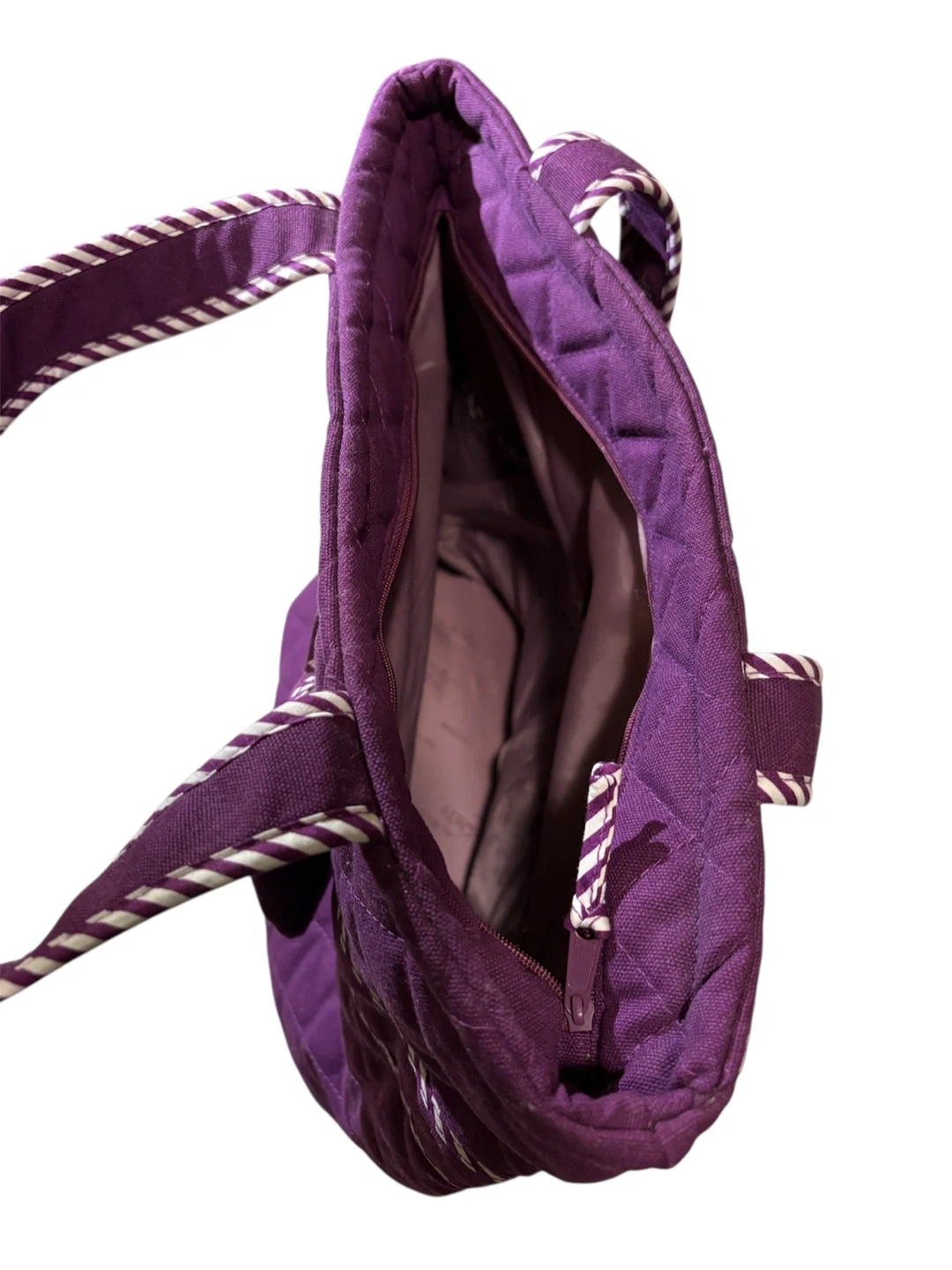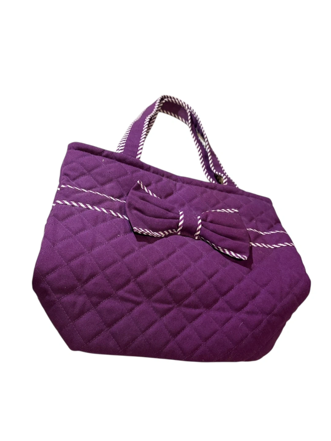 Quilted tote bag from NaRaia in a vibrant purple colour. It features a decorative bow on the front and white and purple striped trim along the handles and seams. The interior has a zippered pocket. This bag's quilted design adds a stylish touch.