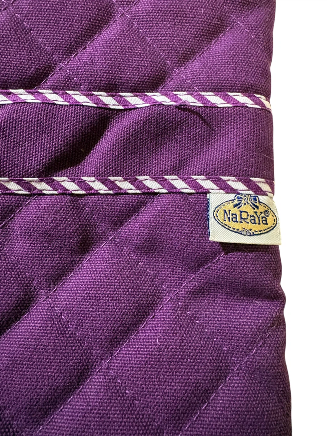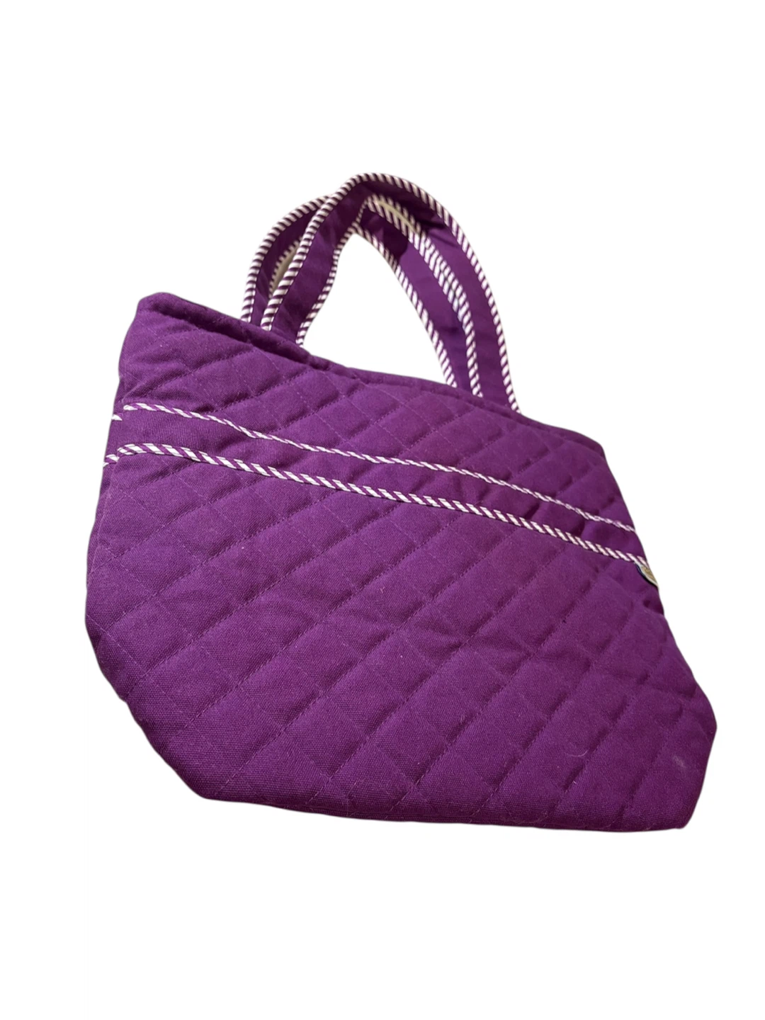 Quilted tote bag from NaRaia in a vibrant purple colour. It features a decorative bow on the front and white and purple striped trim along the handles and seams. The interior has a zippered pocket. This bag's quilted design adds a stylish touch.