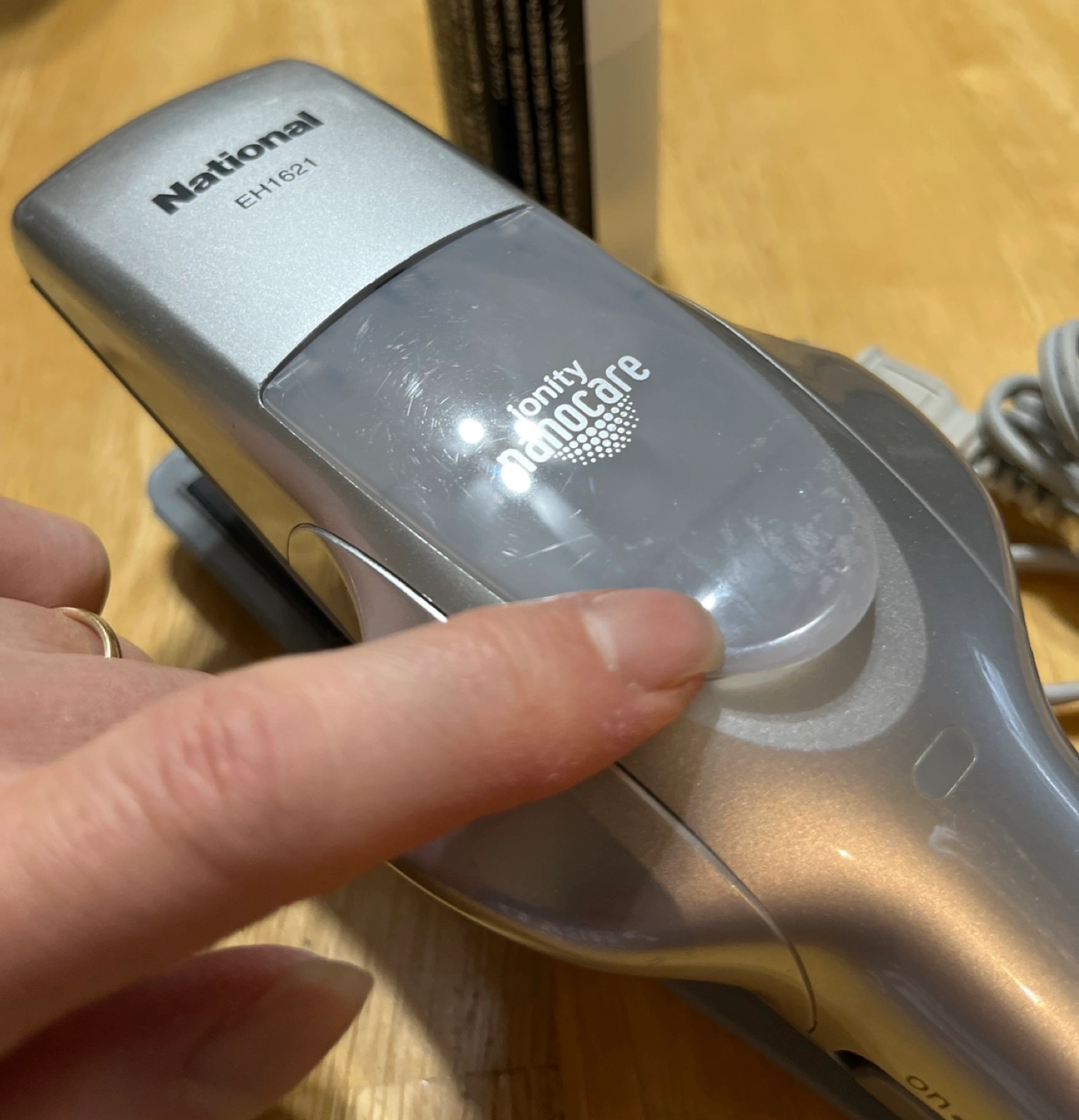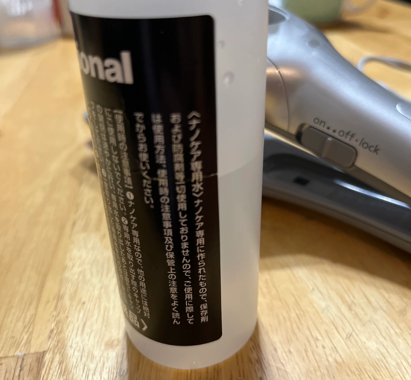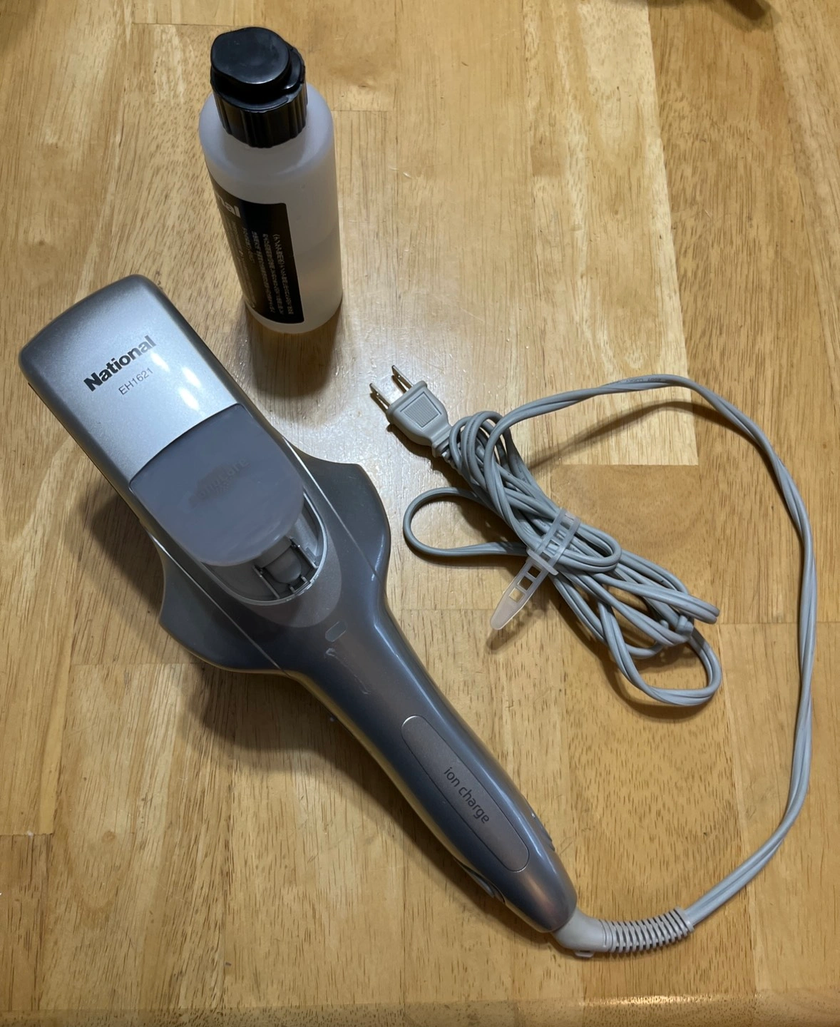 National Nano Care Hair Straightening Iron from Japan. The flat iron doesn’t damage your hair. The lid doesn’t stay closed but a tape would work to keep it closed & works just fine. The distilled water is used. 1/2 bottle is included.