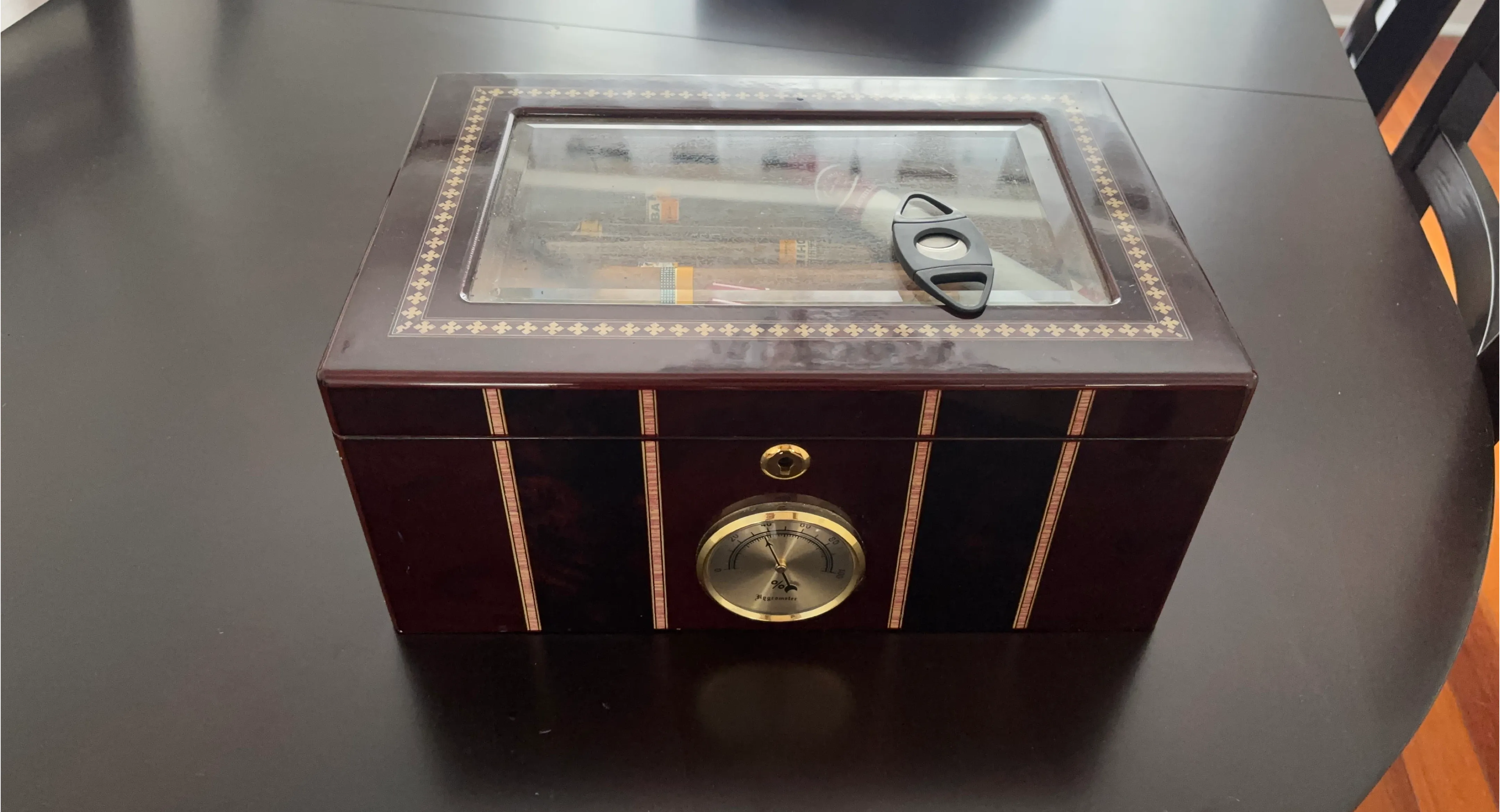 This is a stylish wooden humidor, perfect for storing your cigars. It comes with a built-in hygrometer to monitor humidity levels and includes a cigar cutter. The dark wood finish and decorative inlay add a touch of elegance. Will provide a few cigars as a gift with it.