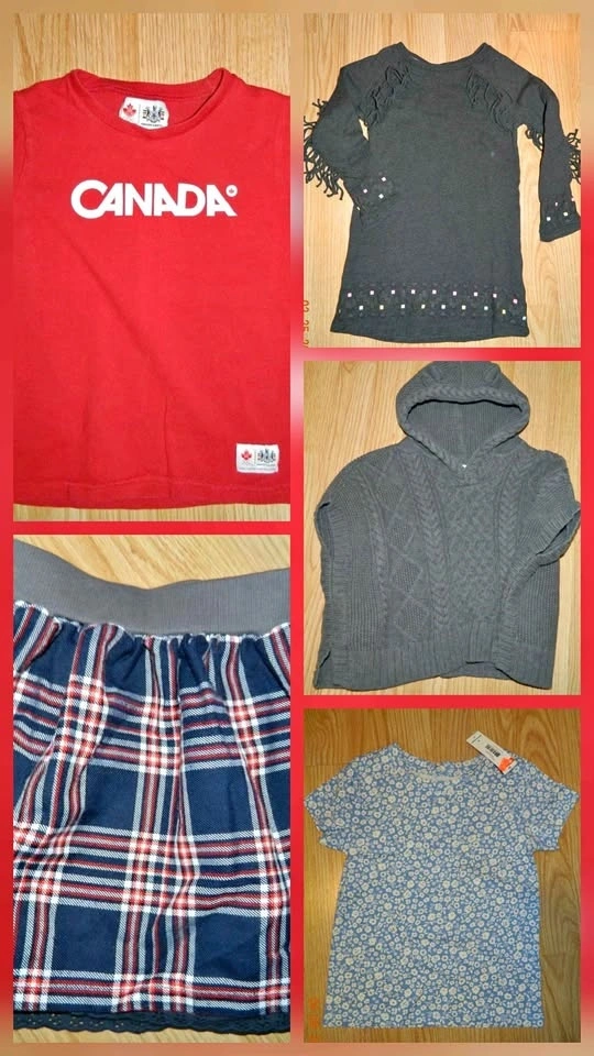 Lot includes: NWT Joe Fresh tee, skirt, HBC Canada tee (5T), Gap hooded poncho, and H&M tunic/dress. All in great condition.