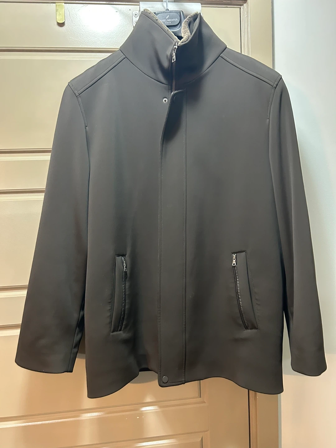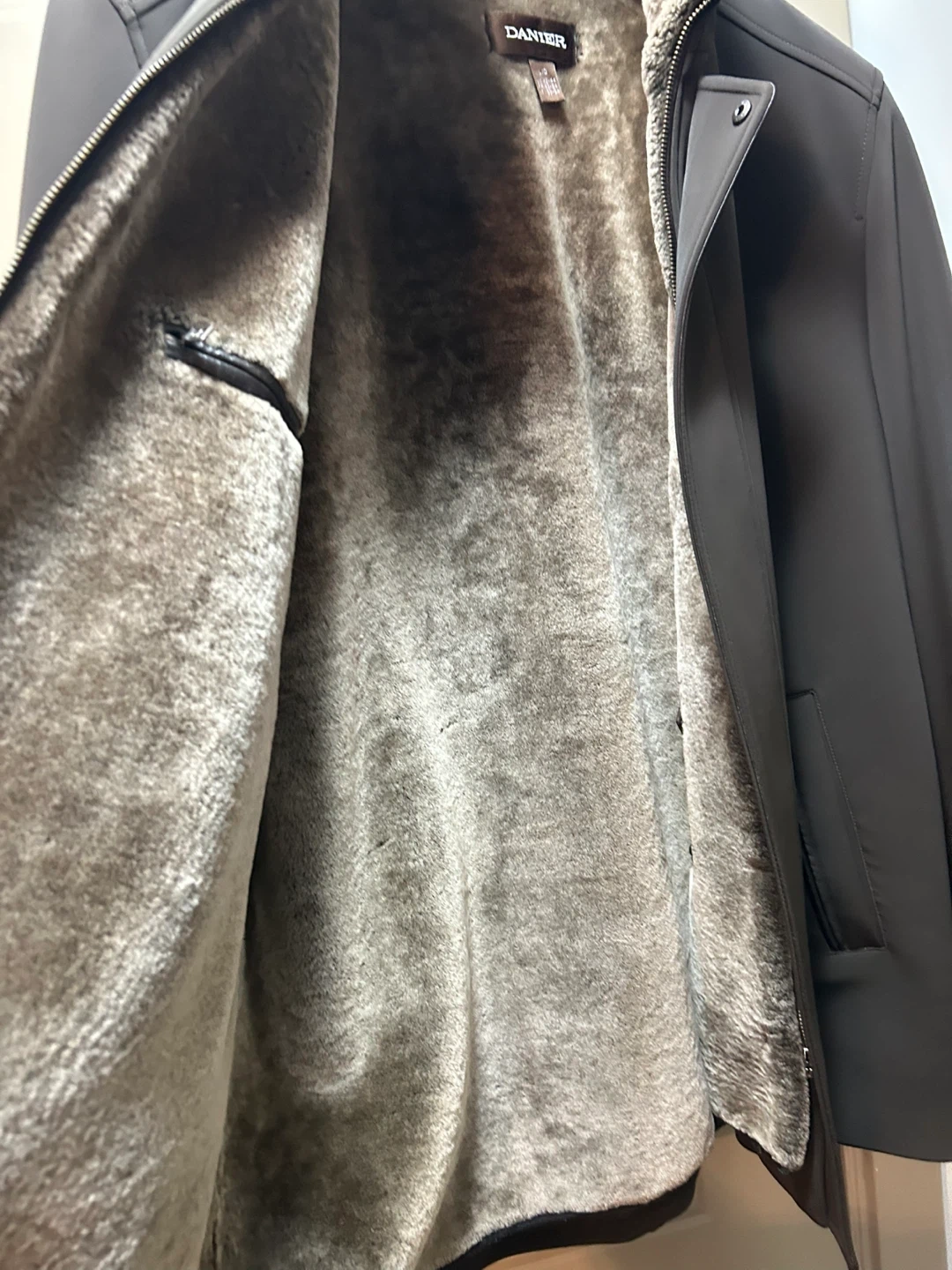 Selling a men's XL dark brown Danier winter jacket. It's in great condition and perfect for the cooler weather. The jacket features a zipper and button closure, along with zippered pockets both on the outside and inside lining. The inside lining is genuine sheep fur and is removable.