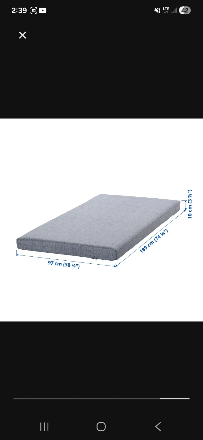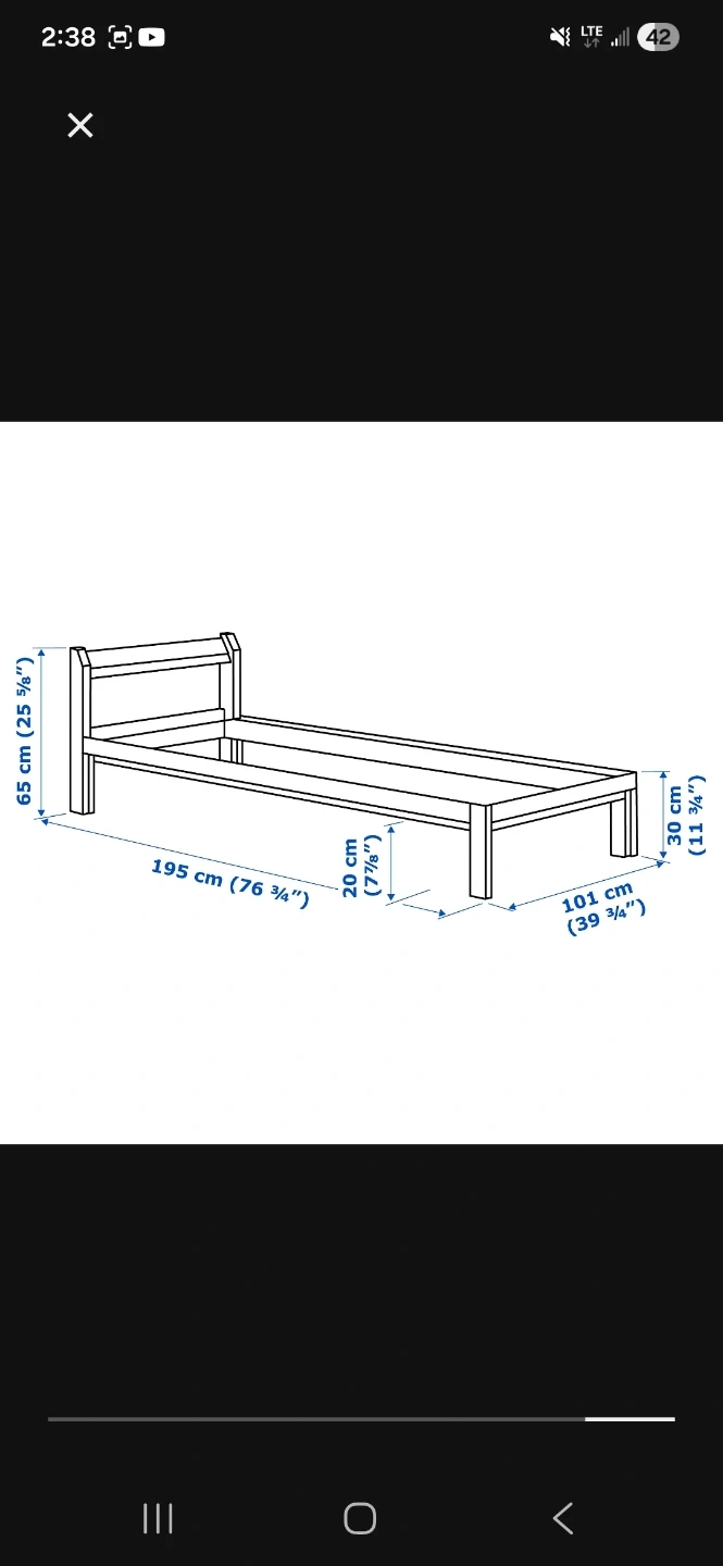 This is an IKEA twin bed frame, made of wood. It measures 195 cm long and 101 cm wide. It comes with a grey IKEA mattress that's 189 cm by 97 cm and 10 cm thick. This set is great for a child's room or a guest bedroom!