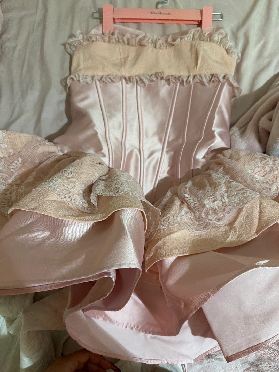 This is a lovely pink satin corset dress with delicate lace trim details. It features a structured corset bodice and a layered skirt. It's perfect for parties or special occasions!
